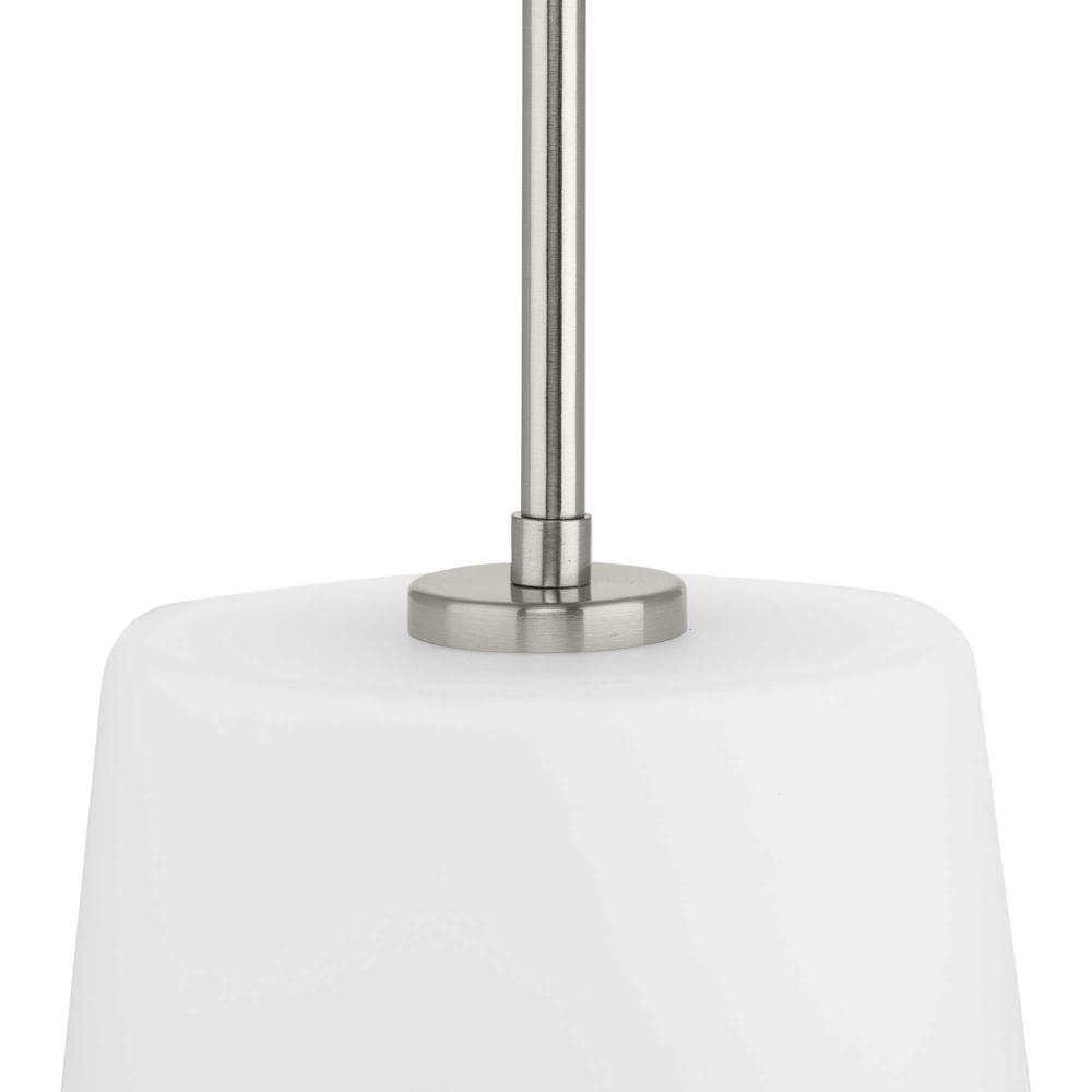Elegant in its simplicity, the versatile Clarion pendant features an etched glass shade that embraces minimalist modernity and functional task lighting. The glass shade rests at the end of a sleek brushed nickel bar that attaches to the ceiling. Each light fixture has a swivel at its base that makes it perfect for installing on flat or angled ceilings.