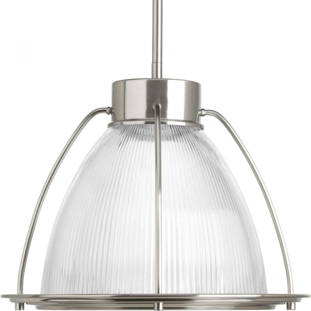 One-light pendant with a bold and striking Prismatic Glass shade as the focal point of the fixture. This pendant also features a sleek Brushed Nickel cap and stems, highlighting the industrial styling. The bottom of the fixture is enclosed with an etched glass diffuser.
