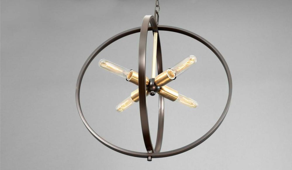 The four-light sphere medium pendant within the Swing Collection features mixed metal accents in an Antique Bronze finish with Vintage Brass candle holders. The vintage undertones adds style to dining rooms and kitchens.
