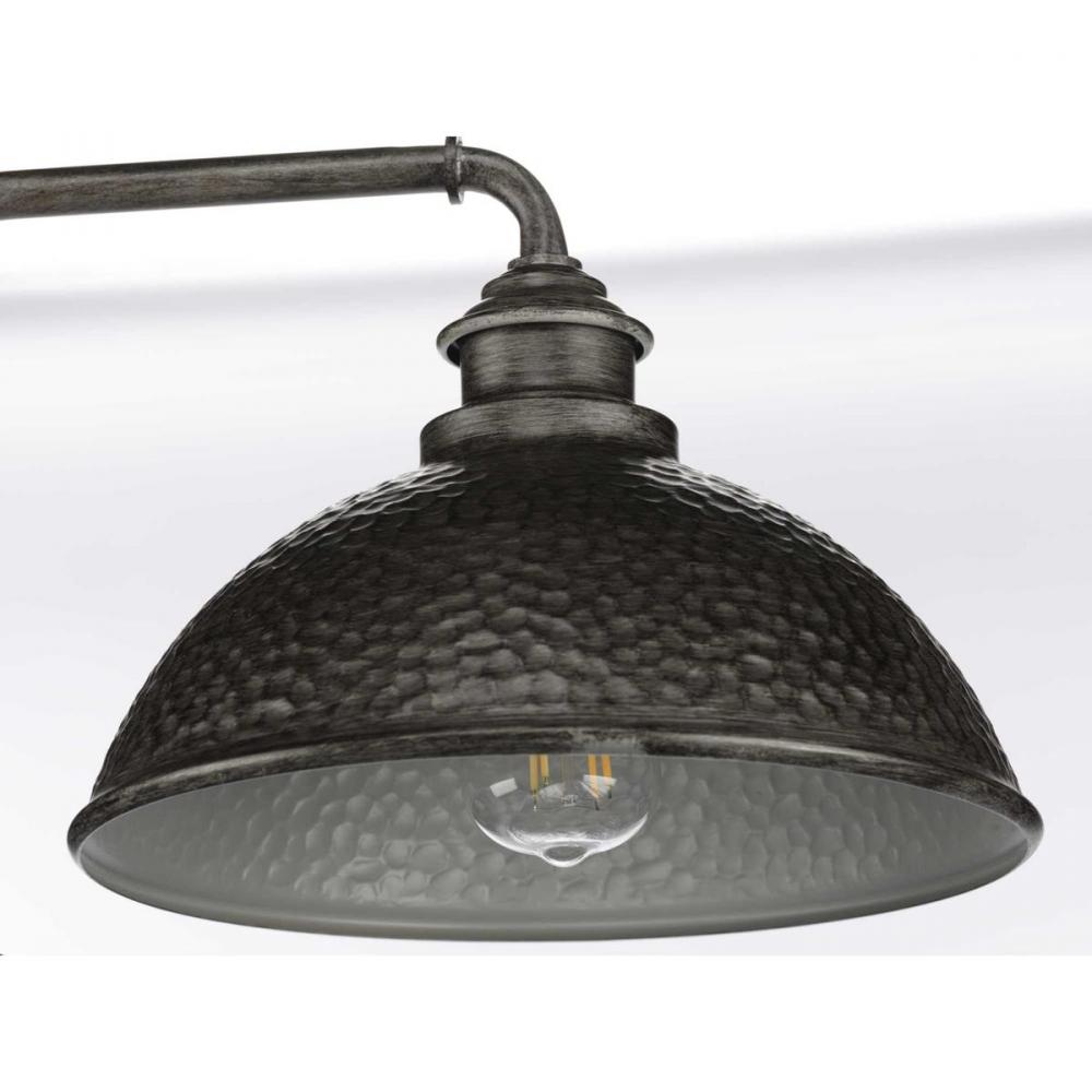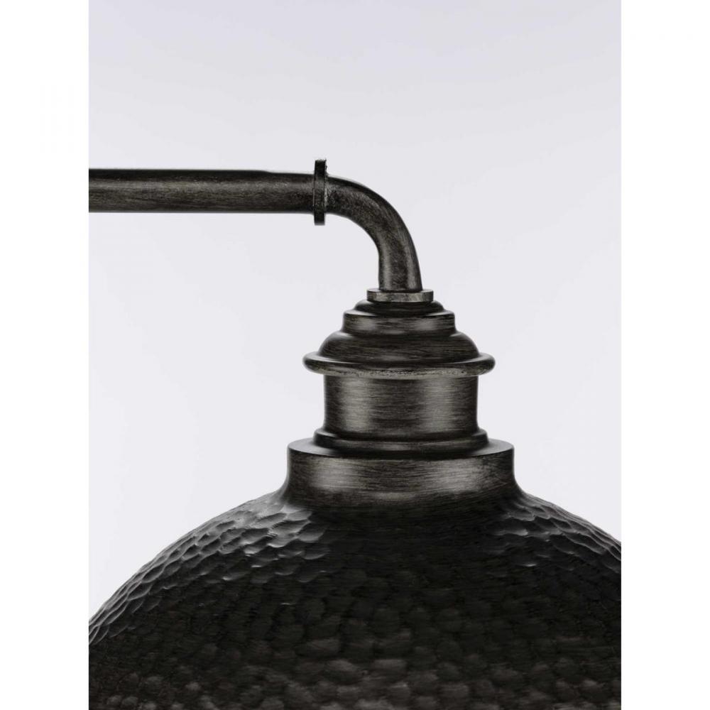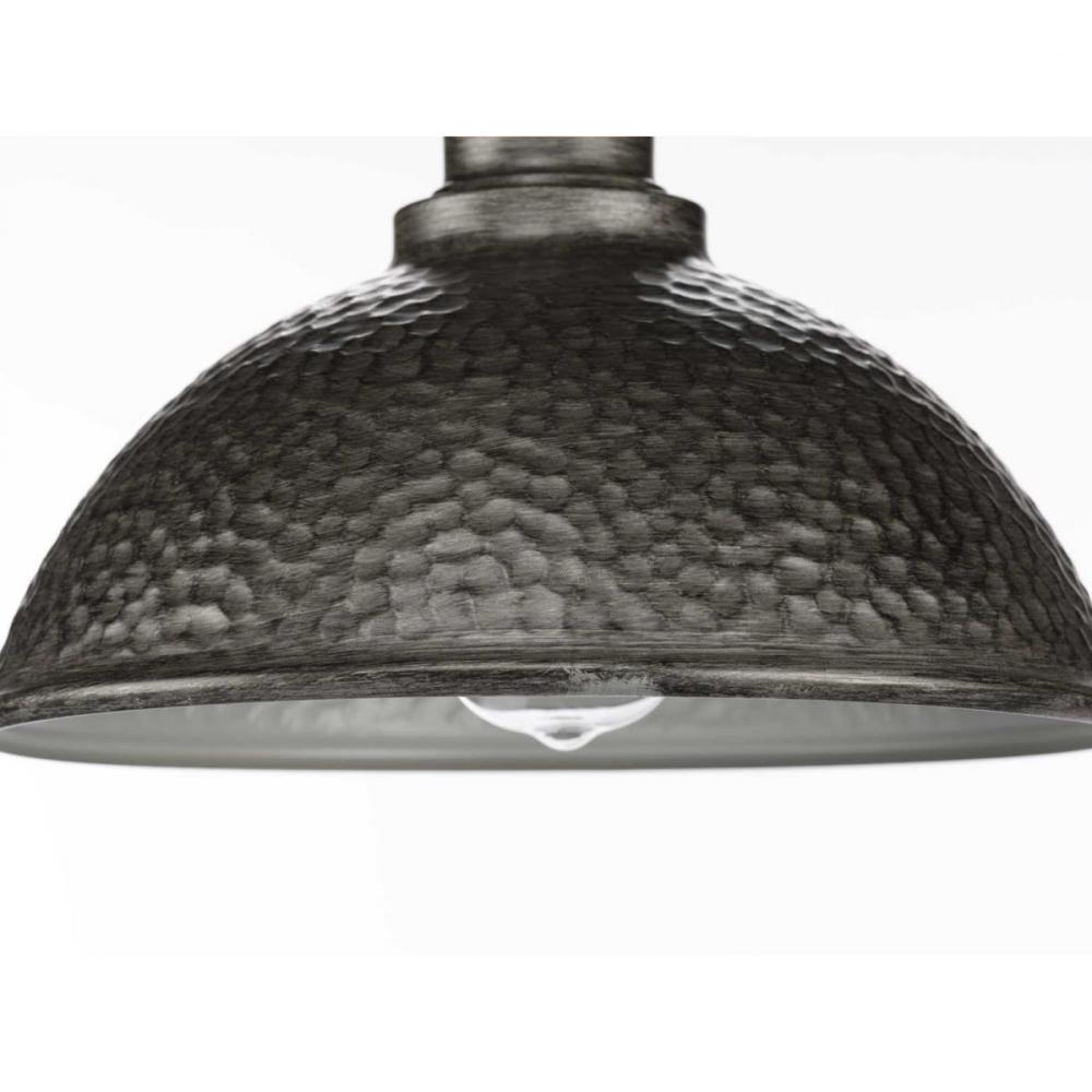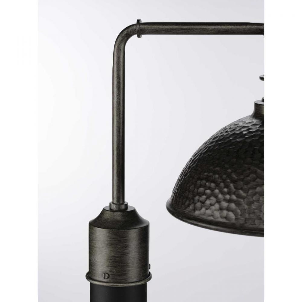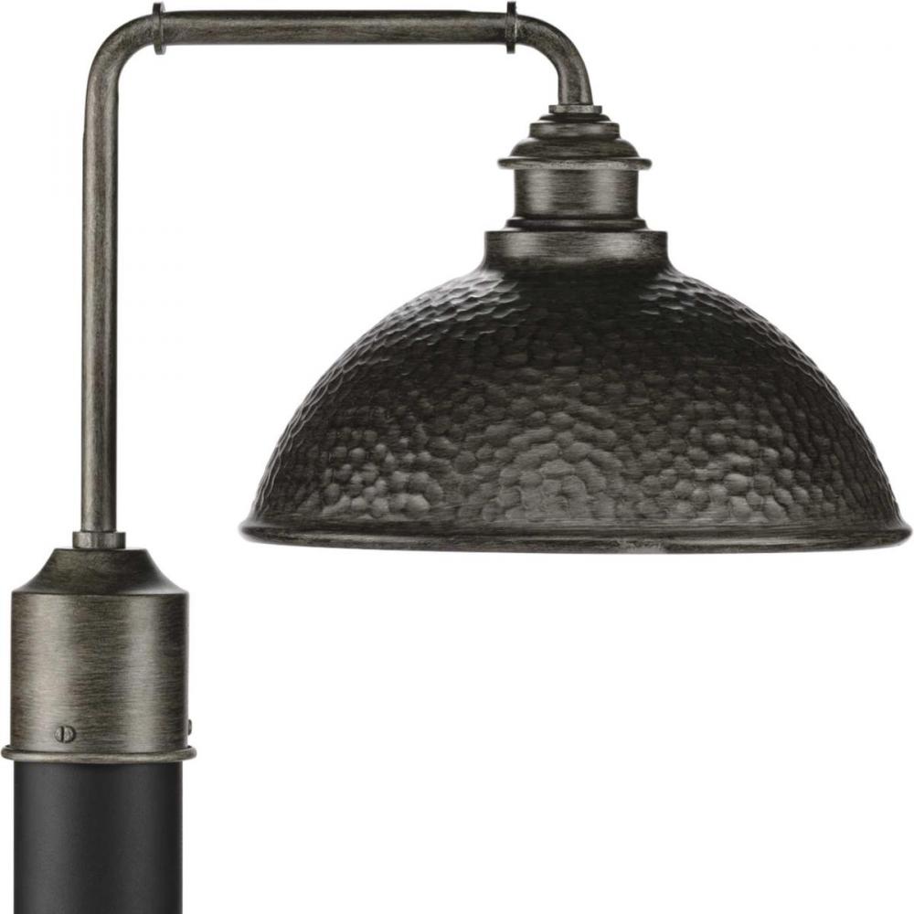 Relax and enjoy an evening basking in the light of the Englewood one-light post lantern in any outdoor space. The fixture’s striking, hammered Antique Pewter shade is accented by a metallic inner shade. The structure’s pipe-like arm gives it an added rustic appeal, making it an excellent choice for farmhouse and rustic exteriors.