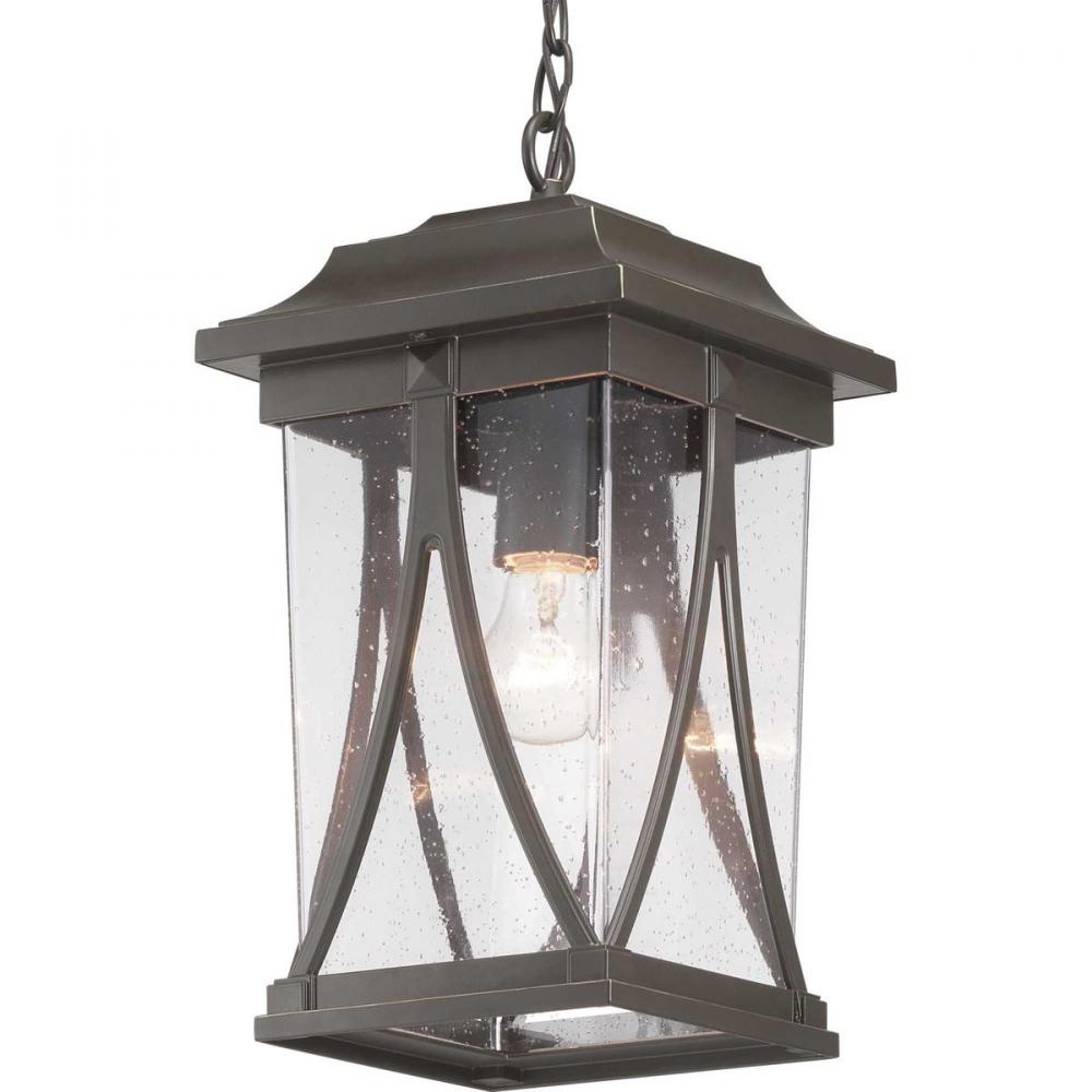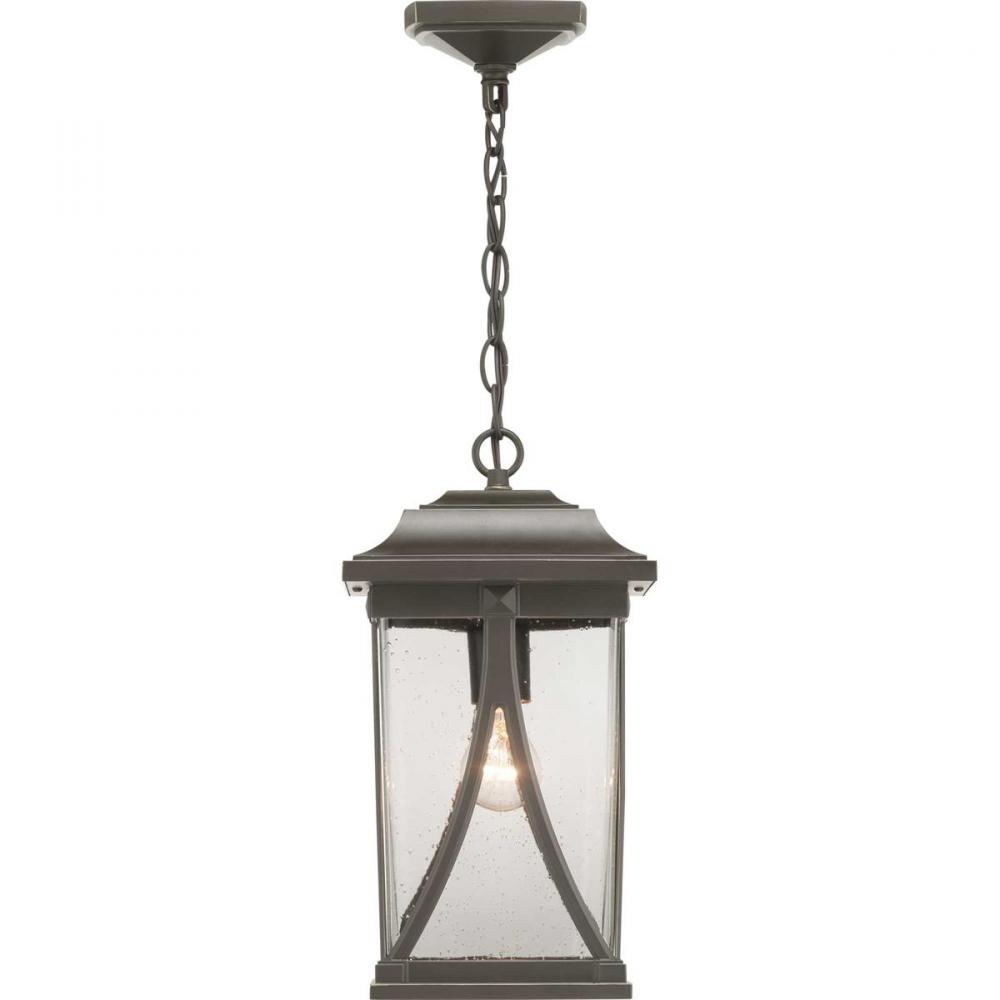 Distinctive forms with ancient roots are featured in this hanging lantern from the Abbott Collection. Transparency, depth and dimension are all on display to highlight the clear seeded glass and sweeping details within the Antique Bronze frame.