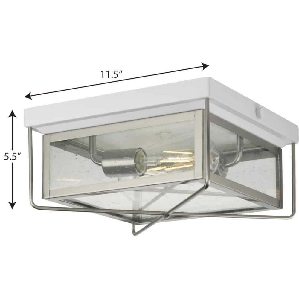 Transform your home into a warm and cozy retreat with the Barlowe Collection 2-Light Stainless Steel Clear Seeded Glass Farmhouse Outdoor Flush Mount Ceiling Light. A rustic cross-brace design decorates the charming square silhouette coated in a crisp stainless steel finish. Light sources glow through clear seeded glass panes add an extra pop of rustic personality.