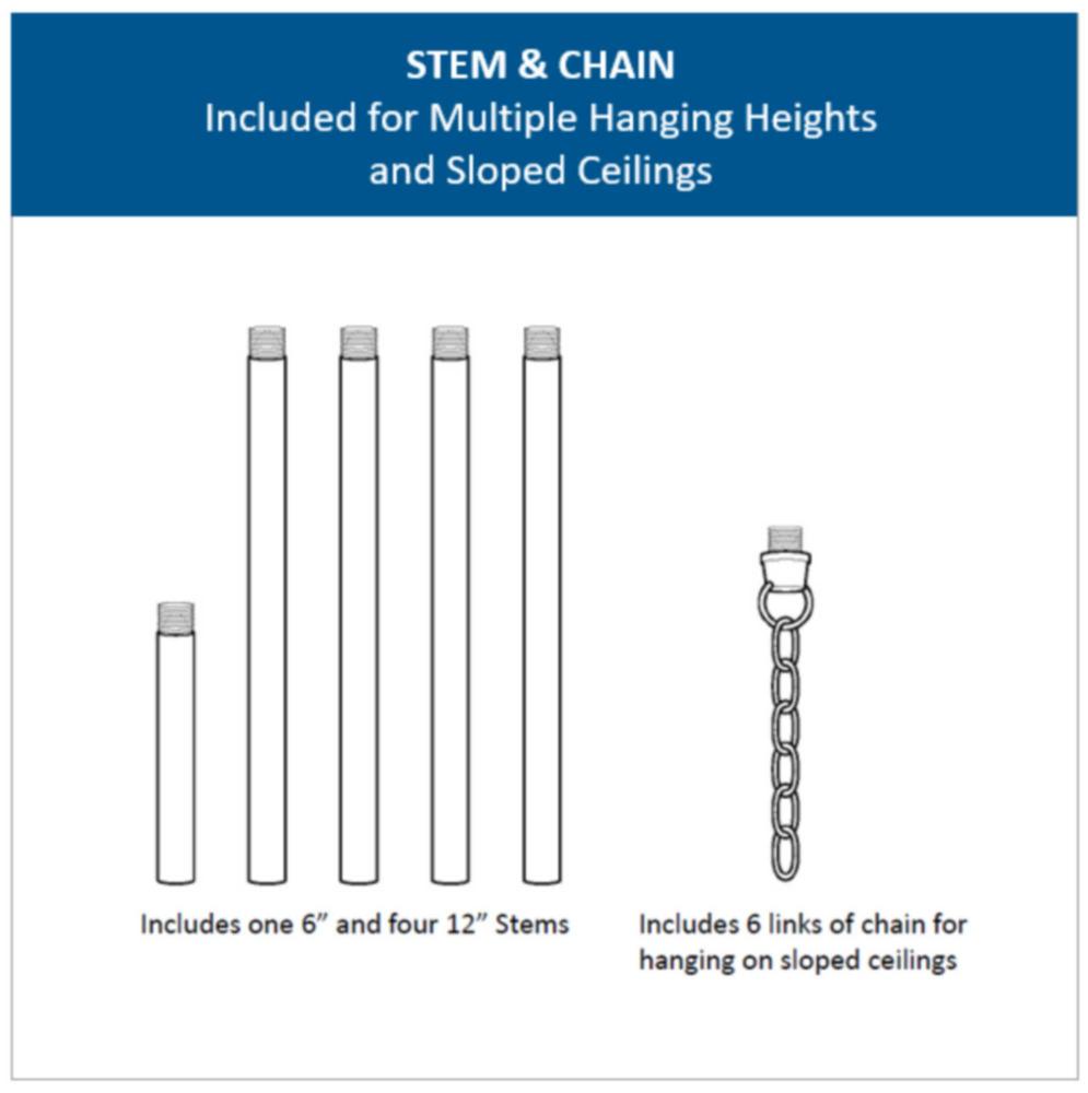 Casual feel with vintage flair.;Complements both interiors and exteriors.;Finely crafted accents highlight clear seeded glass.;Includes one 6", four 12" stems and 6 Links of chain.