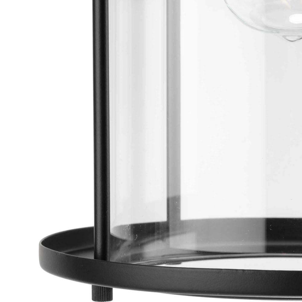 The light is coated with a soft matte black finish, creating a beautiful backdrop for the clear glass shade