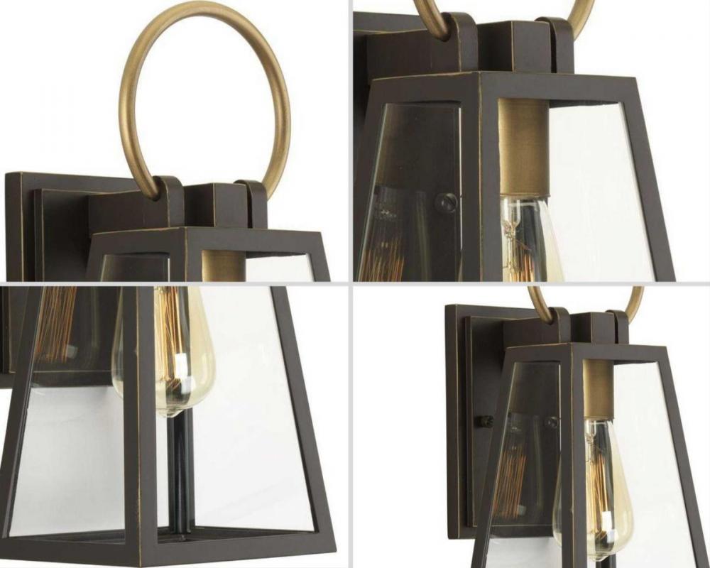 Barnett lanterns deliver timeless appeal with a decidedly modern flair;Features dramatic overscaled loop in a contrasting brass-tone finish;Antique Bronze finish;Large clear panes of glass frame your choice of traditional or vintage style bulbs;Wall lanter