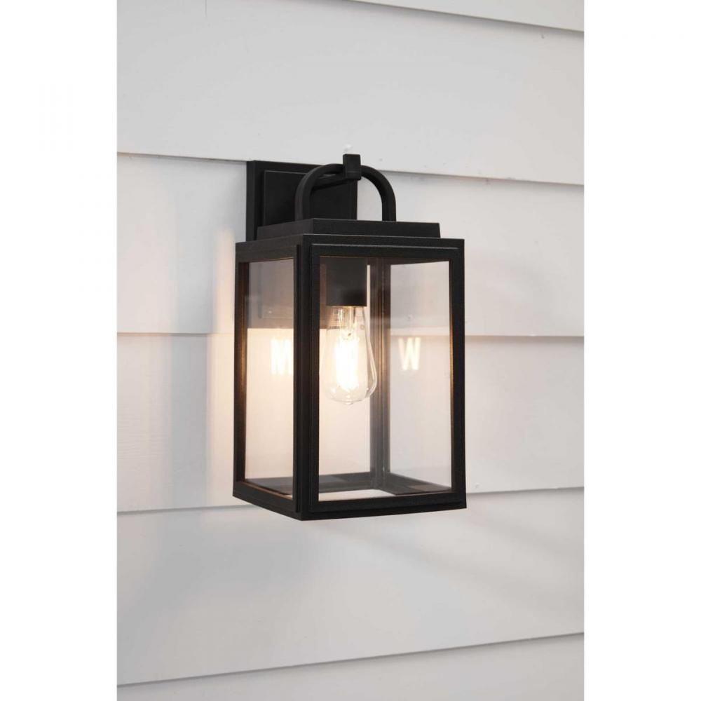 Partner timeless elegance with a pinch of coastal vibe with this wall lantern. A beautiful black square frame crafted from corrosion-proof composite polymer material features a half loop on top of the structure. The light fixture's clear glass panes allow the lantern to complement other farmhouse and coastal decor for an overall beautiful, welcoming look. DURASHIELD by Progress Lighting is built to last. Constructed from a composite material with UV protection, DURASHIELD holds up even in the harshest weather conditions. This high-performance finish has a 5-year warranty and is resistant to rust, corrosion, and fading.