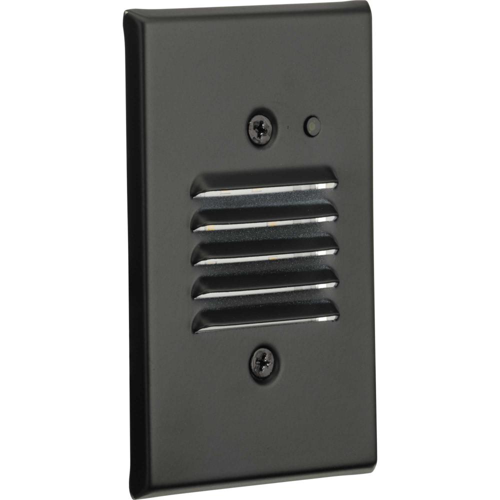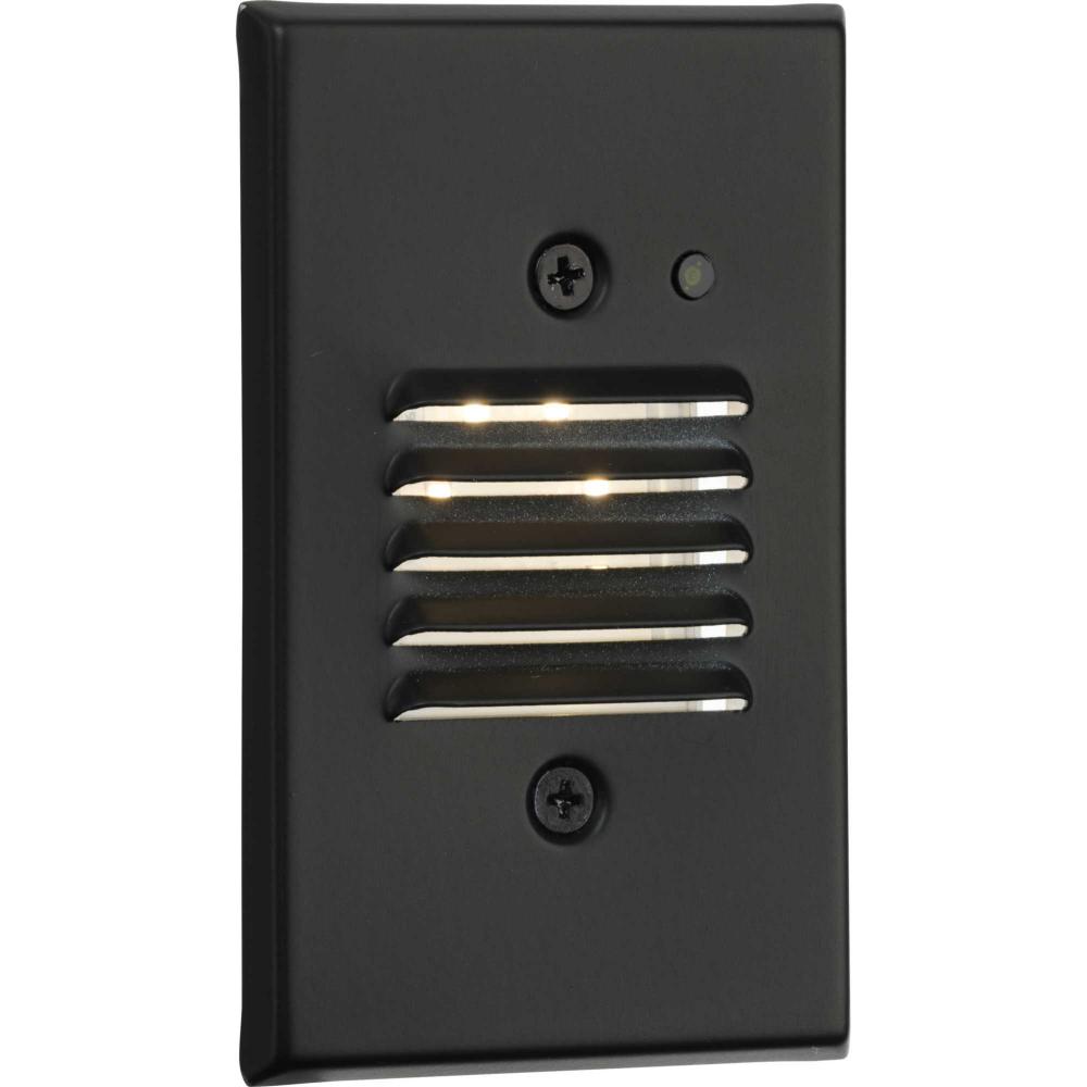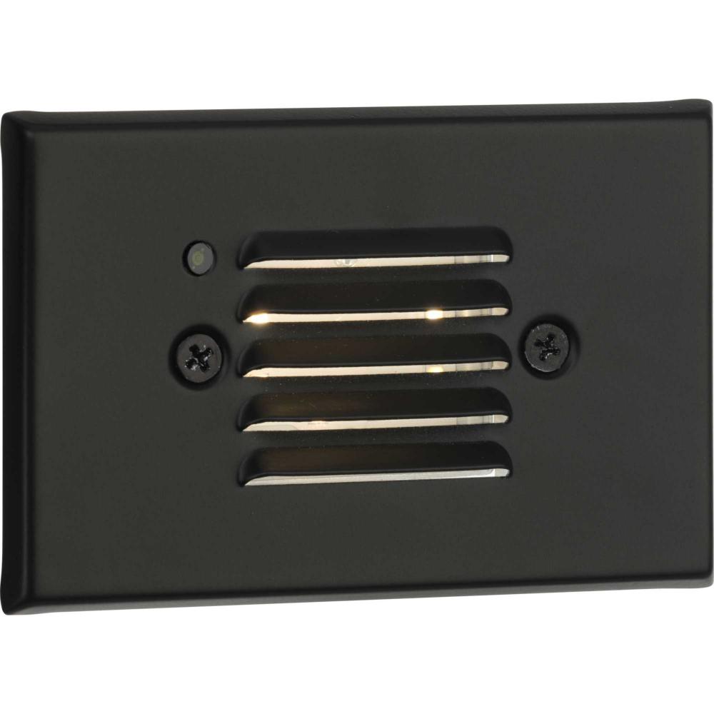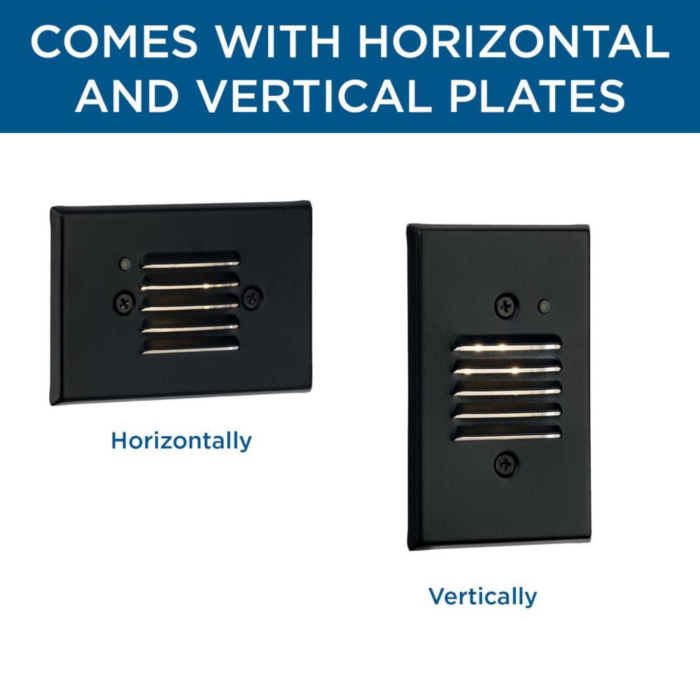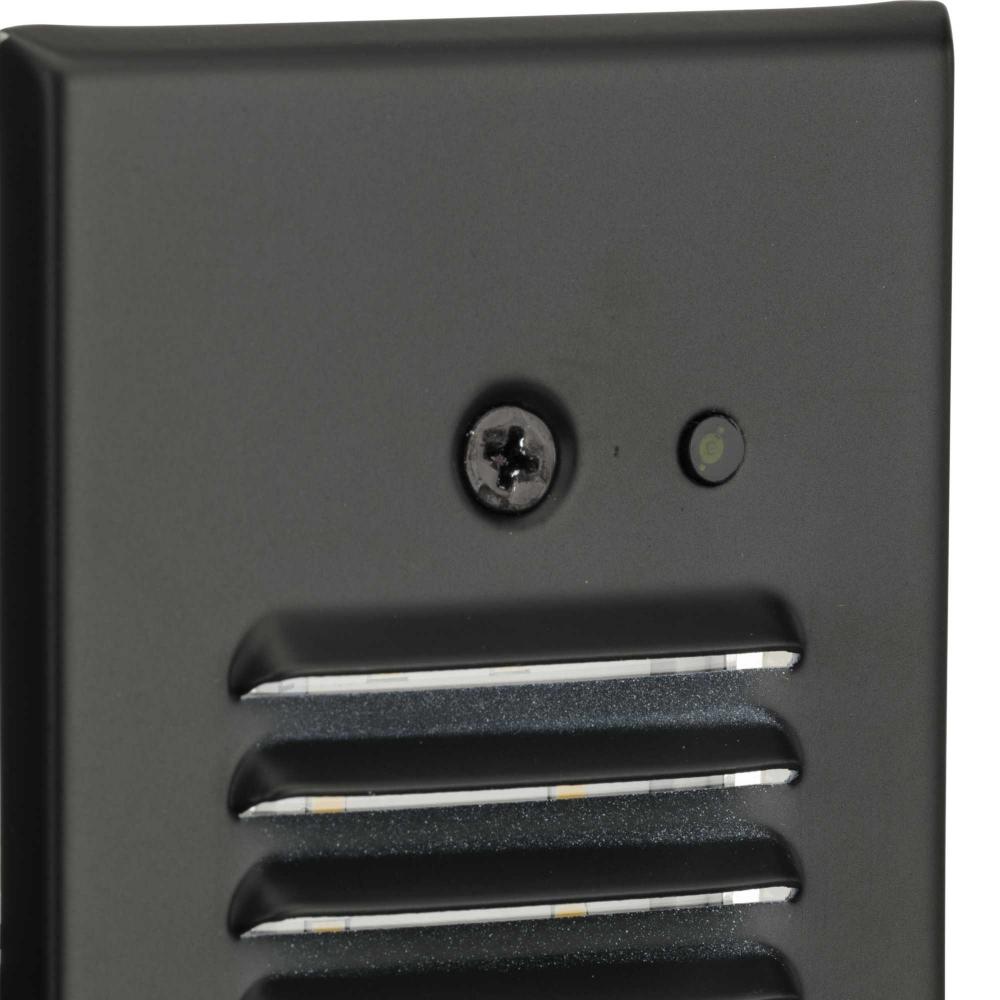 The LED Step/Wall Light finished in classic black offers an elevated look to exterior architectural styles, whether residential or commercial. A horizontal and a vertical exterior face plate are provided to accommodate either a horizontally or vertically oriented installation. The step light features an integrated photocell with automatic dusk to dawn operation, automatically turning the fixture on and off at sunset and sunrise, eliminating the need for additional controls. The photocell and LED assembly is enclosed in a gasketed lens, allowing it to meet the rigorous demands of wet location use. The louvered face plates direct the light downwards to minimize glare and clearly illuminate stairs, walls, and walkways, resulting in performance, cost and safety benefits. It is cCSAus wet location rated for use in areas with direct water contact. .