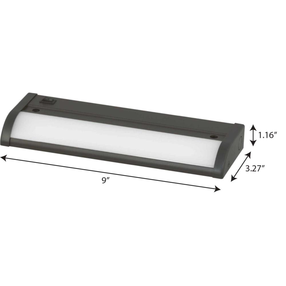 9" linear undercabinet fixture;Antique Bronze powder coat finish;Extruded aluminum construction;Angled lens design to ensure proper illumination;Integral ON/OFF switch;Dimmable to 10% with many Forward Phase (Triac) or Electronic Low Voltage (ELV) dimm