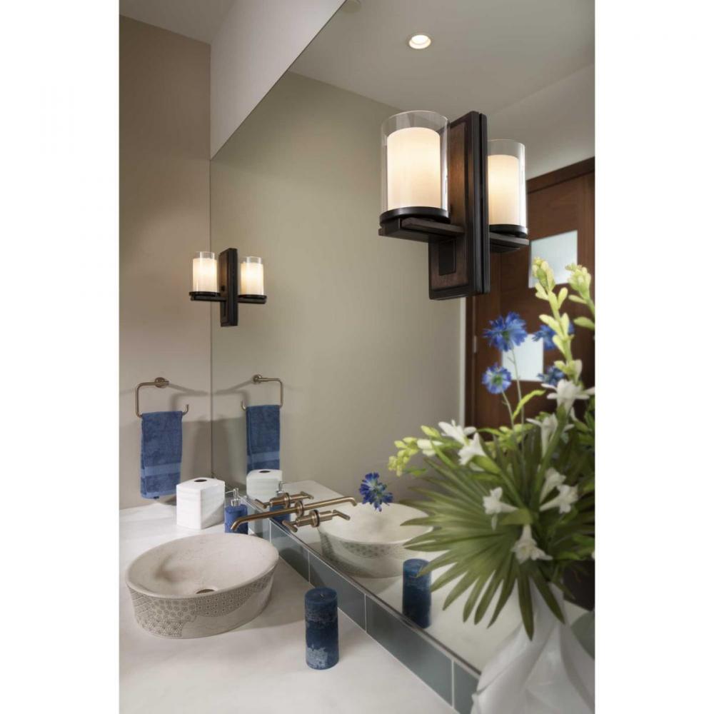 Mast has a zen-like modernism that blends the warmth of a faux-finish wooden backplate with a clean, modern pediment supporting a double-glass diffuser. The combination of clear and etched glass recreates the appearance of a votive candleholder to enhance the calming influence of this distinctive style. Antique Bronze finish.