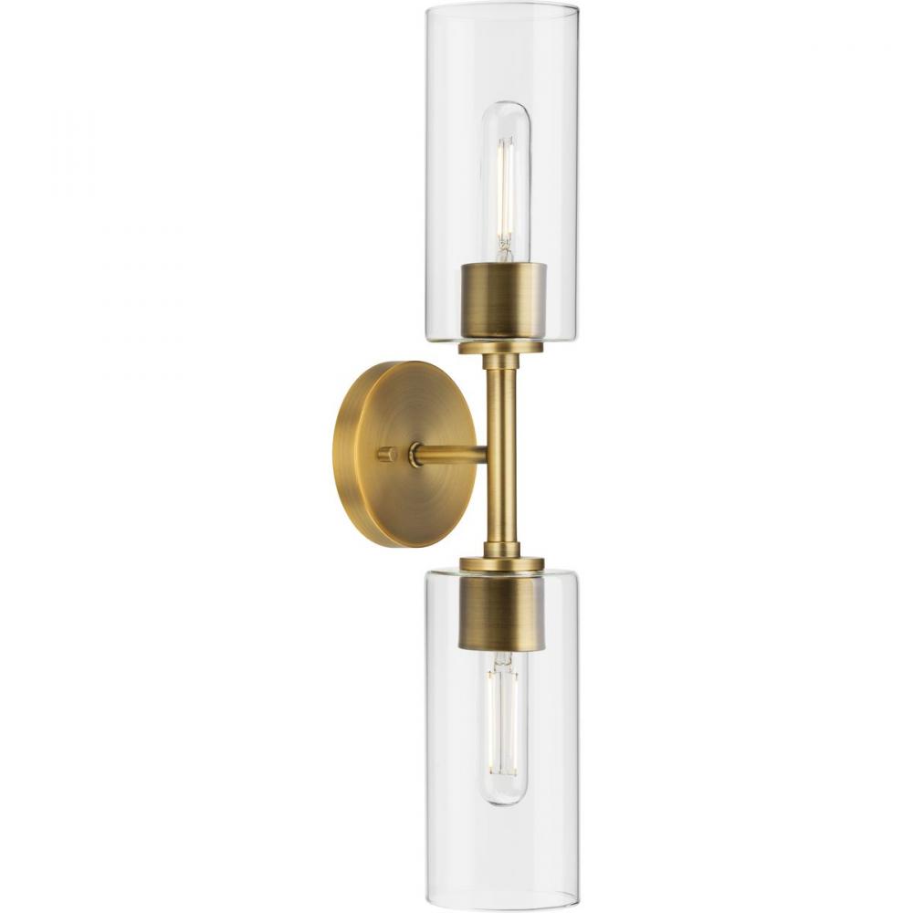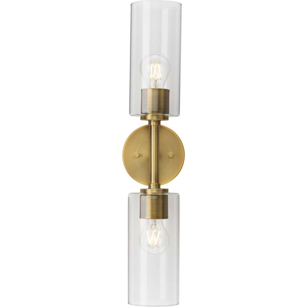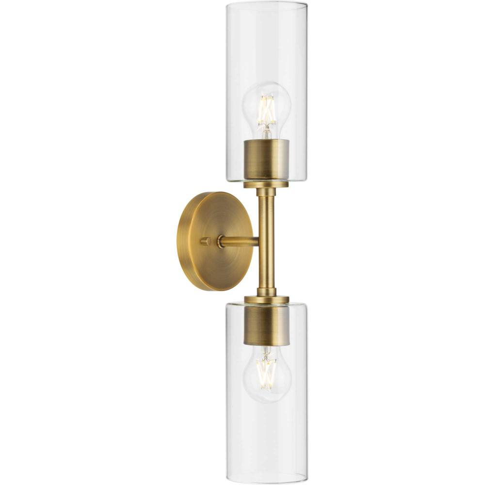 The fixture is coated with a gold-toned, vintage brass finish, offering an elegant transitional design