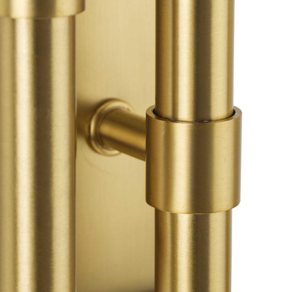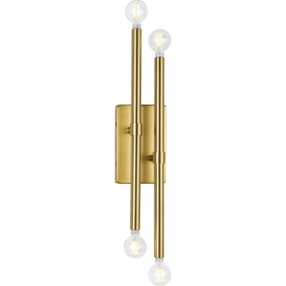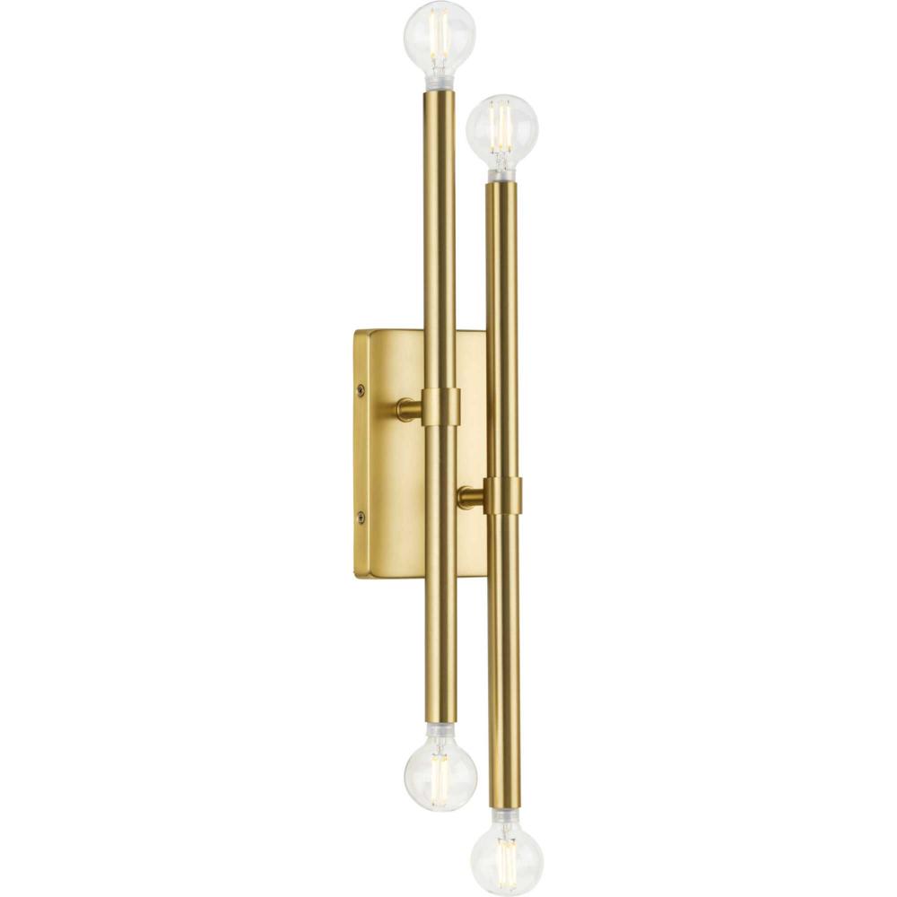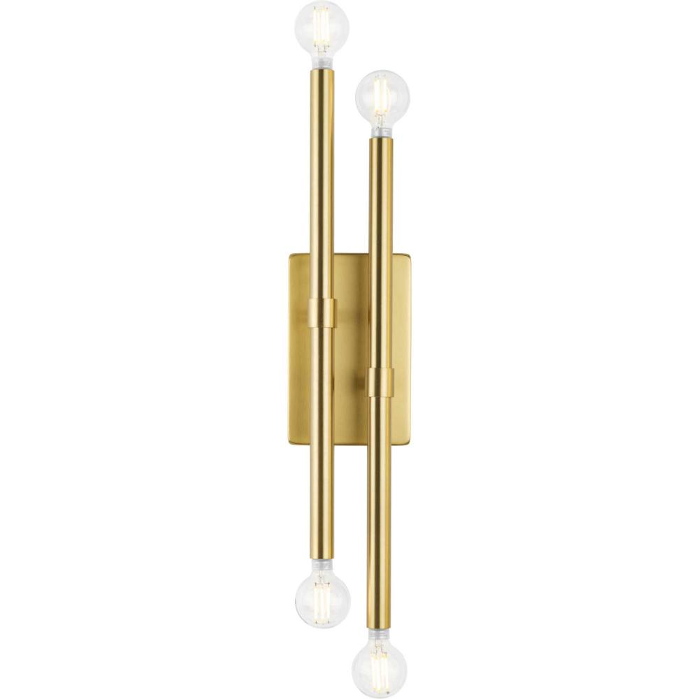 The Arya Collection has a lively essence created by the rhythm of slender, graceful features. The style offers modern appeal with understated elegance.A pair of staggered arms coated in a soft brushed gold are attached to a simple square backplate, defining this bold architectural form. The minimalist wall bracket brings a modern flair to ceilings in dining rooms, bedrooms and living rooms in luxe, mid-century modern and contemporary settings. It can be mounted horizontally or vertically. This fixture is part of the Progress Lighting Design Series, a lighting collection offering fashionable styles and affordable luxury lighting for the home.