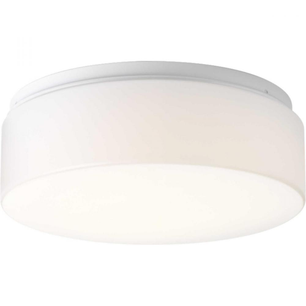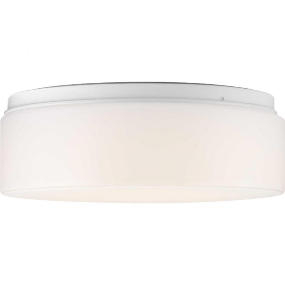 LED flush mount with white acrylic diffuser mounts to baked enamel ceiling pan. Twist on installation with a single locking thumb screw. ETL approved for damp locations. Ceiling or wall mount. 1680 lumens, 80 lumens/watt (delivered), 3000K and 90CRI. ENERGY STAR and Title 24. White finish.