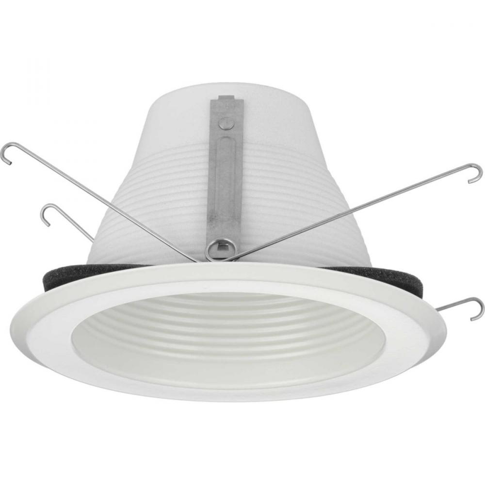 5" Shallow Step Baffle Trim in a Satin White finish. One-piece construction with integral matching satin white powder painted metal flange. The trim uses friction springs to attach to the housing to provide a flush fit against the ceiling. Compatible for use in Progress P851-ICAT and P1841-ICAT.