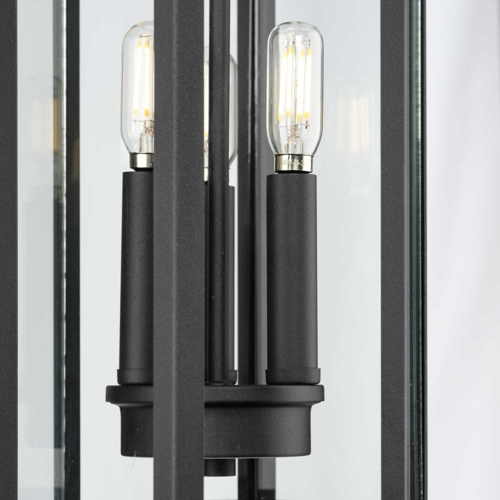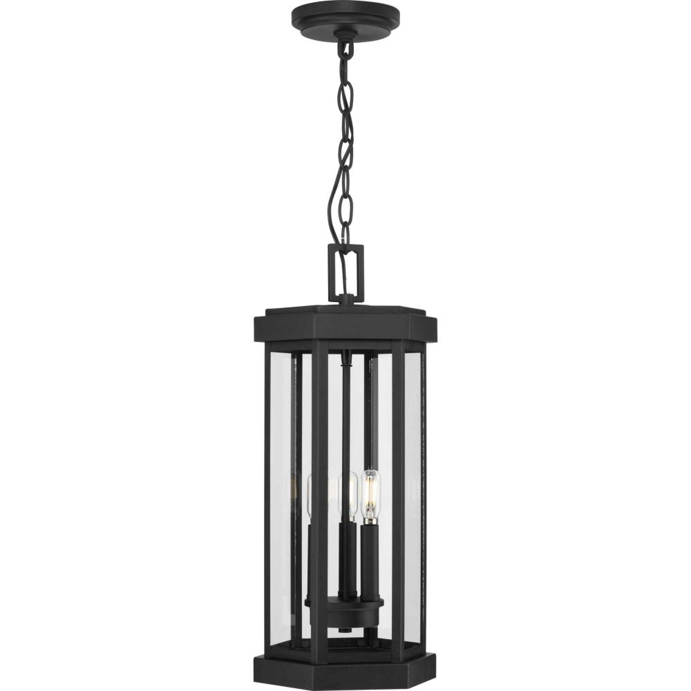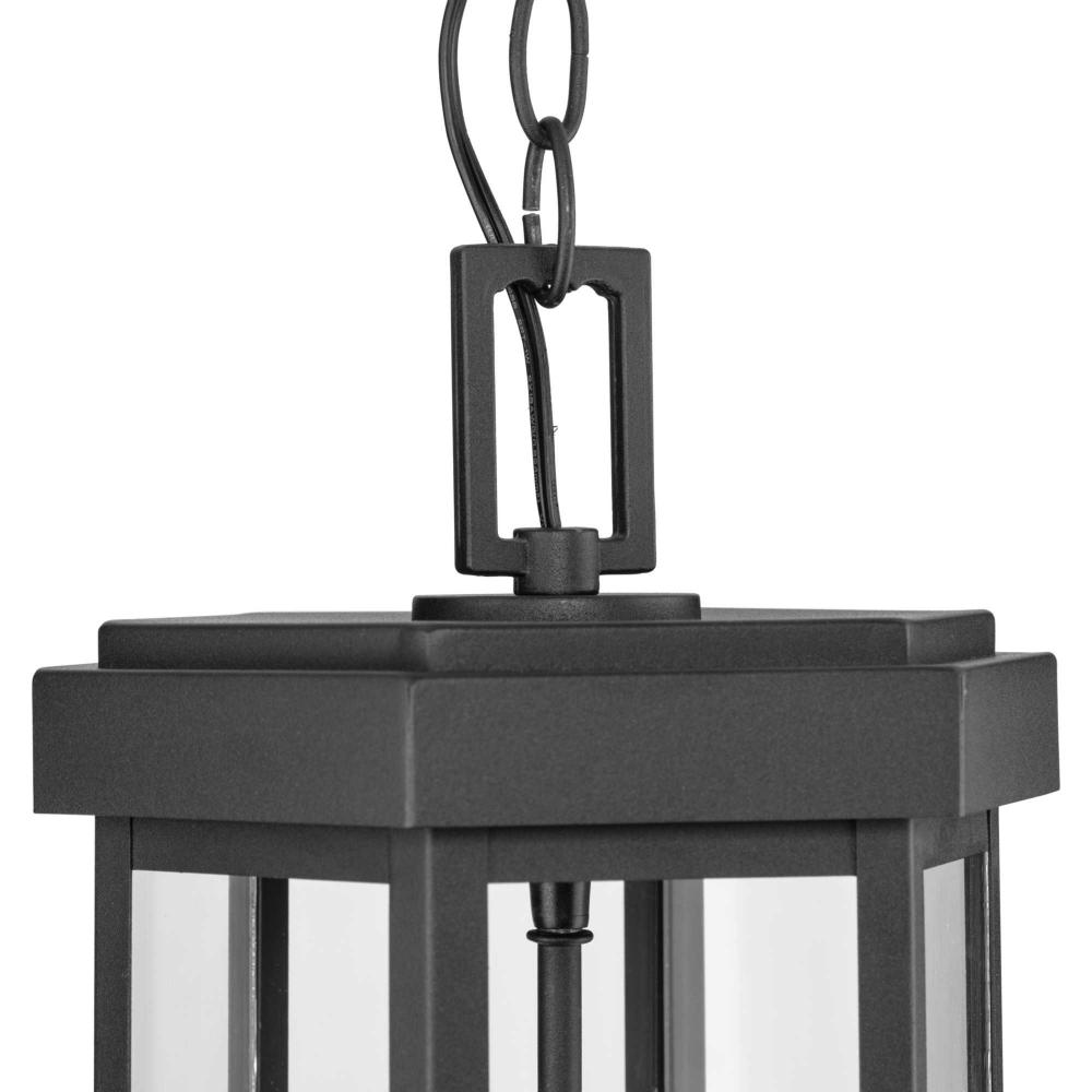 The hanging lantern is coated in a textured black finish, highlighting the frame's distinct silhouette