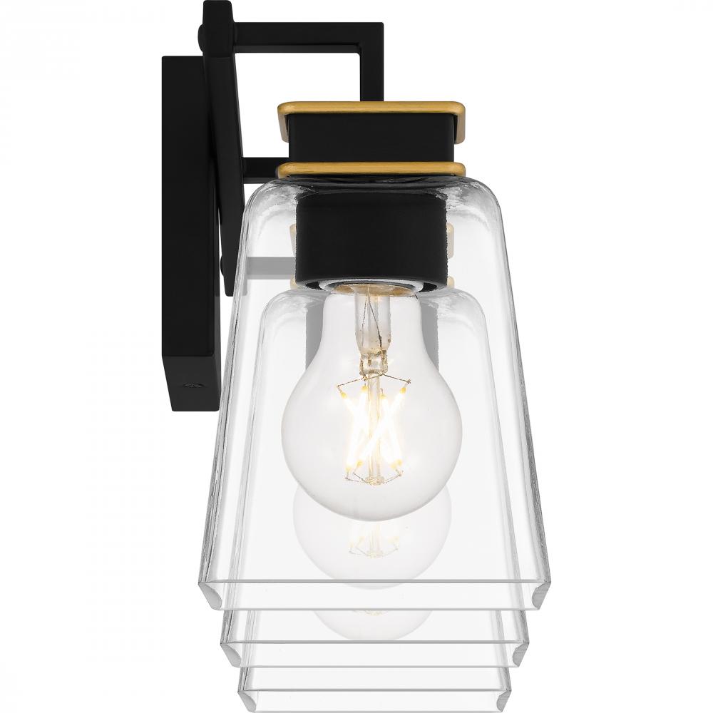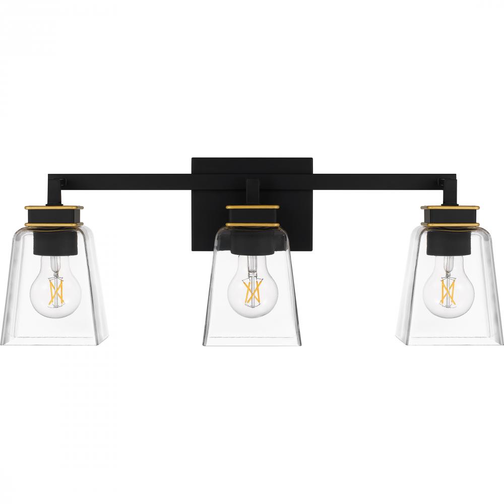 With a sleek matte black finish and gold accents, Almany bath lights make a modern statement over any vanity. The clear glass shades maximize radiance and showcase the bulbs of your choice, while aged brass accents add a touch of glam detail . This versati