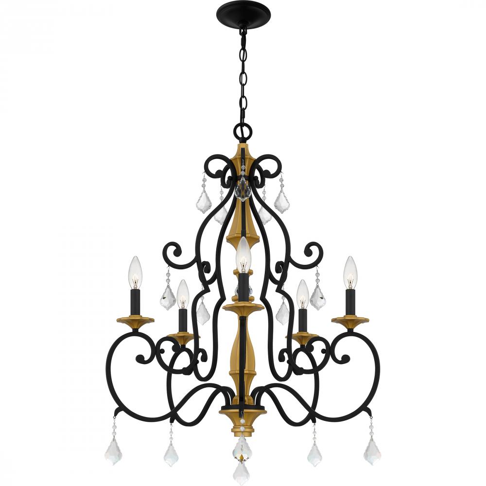 The Althea chandelier is a sparkling piece of jewelry that adds beautiful illumination and elegance to any space. A classic matte black finish pairs with painted gold accents for a rich, dual-tone effect. Clear crystal accents hang delicately in layers to