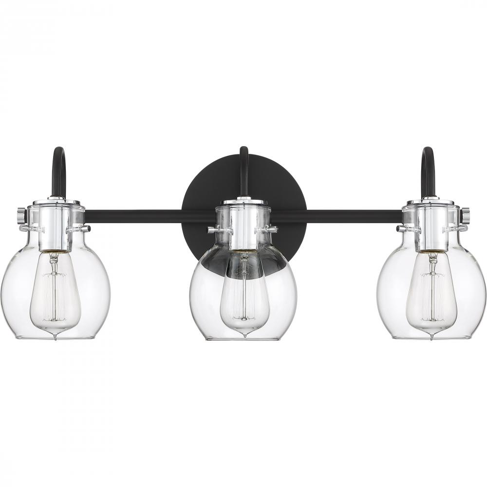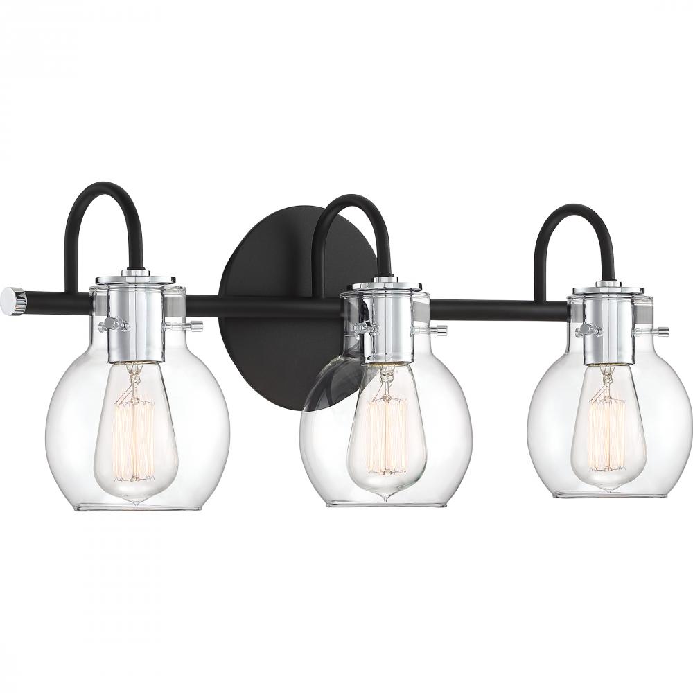 The ageless style of the Andrews Bath Collection is synonymous with classic industrial design. The clear glass shades encircle the sockets and appear as though they are floating over the vintage filament bulbs. The earth black finish on the backplate, s