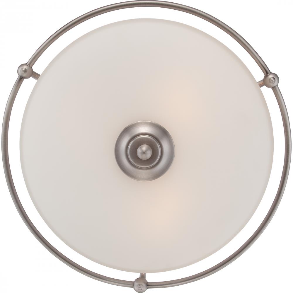 This understated style provides a stylish soft modern look for most any room. The etched shade is painted white inside diffusing the light evenly and illuminating your home with a soothing glow. It is held in place by softly curved arms and is availabl
