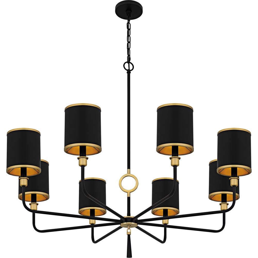 The Lockery chandelier combines traditional style with an updated twist, featuring a sleek matte black finish that complements any decor. The metal shades, with their striking gold interiors, are designed to enhance light output and create a warm, inviting