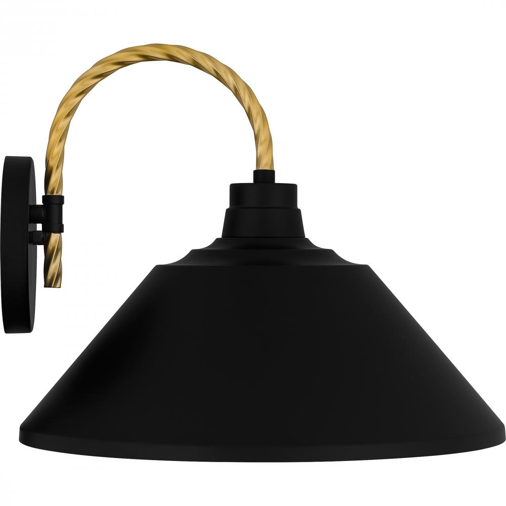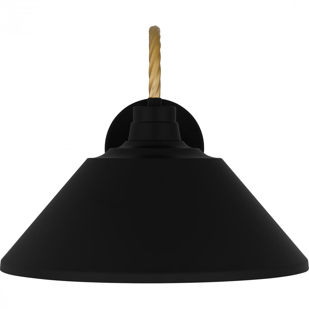 Matte black and gold make a perfect pairing in the Longshore outdoor wall lantern. The black metal shade is accented by a gold braided rope design that takes the place of a traditional hook. With its coastal inspired design and sleek silhouette, Longshore