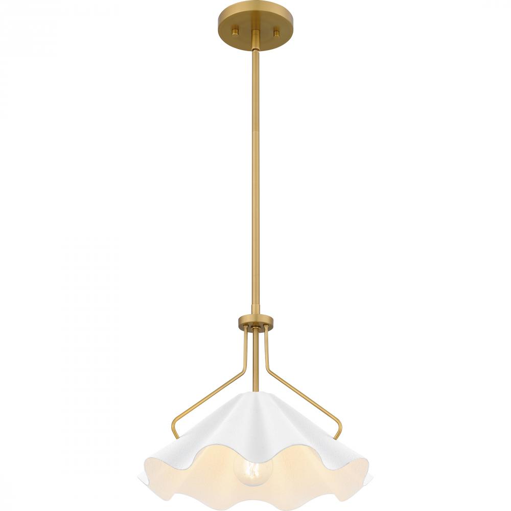 Combining a playful silhouette with modern styling, the Mejia pendant light offers a striking update to any space. The white metal shade featuring a unique swirling design adds drama, while an aged brass finish adds a gold shine. Hung individually or in a