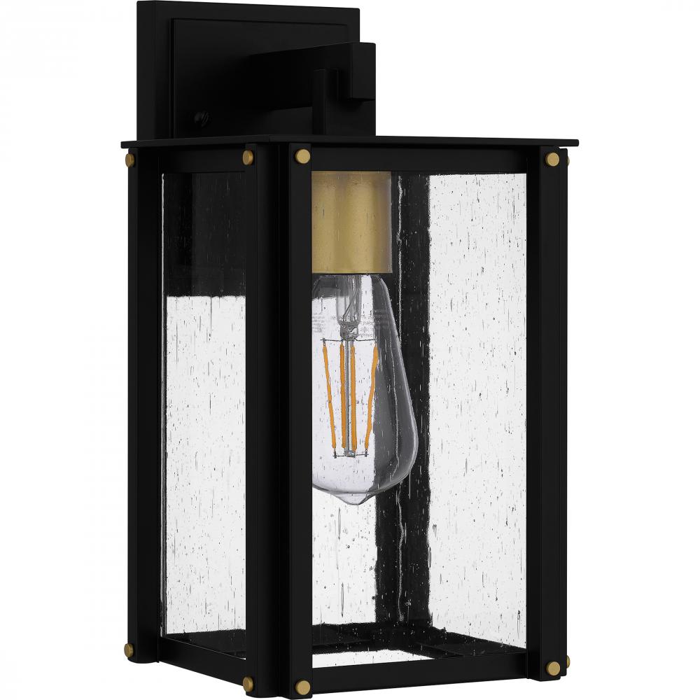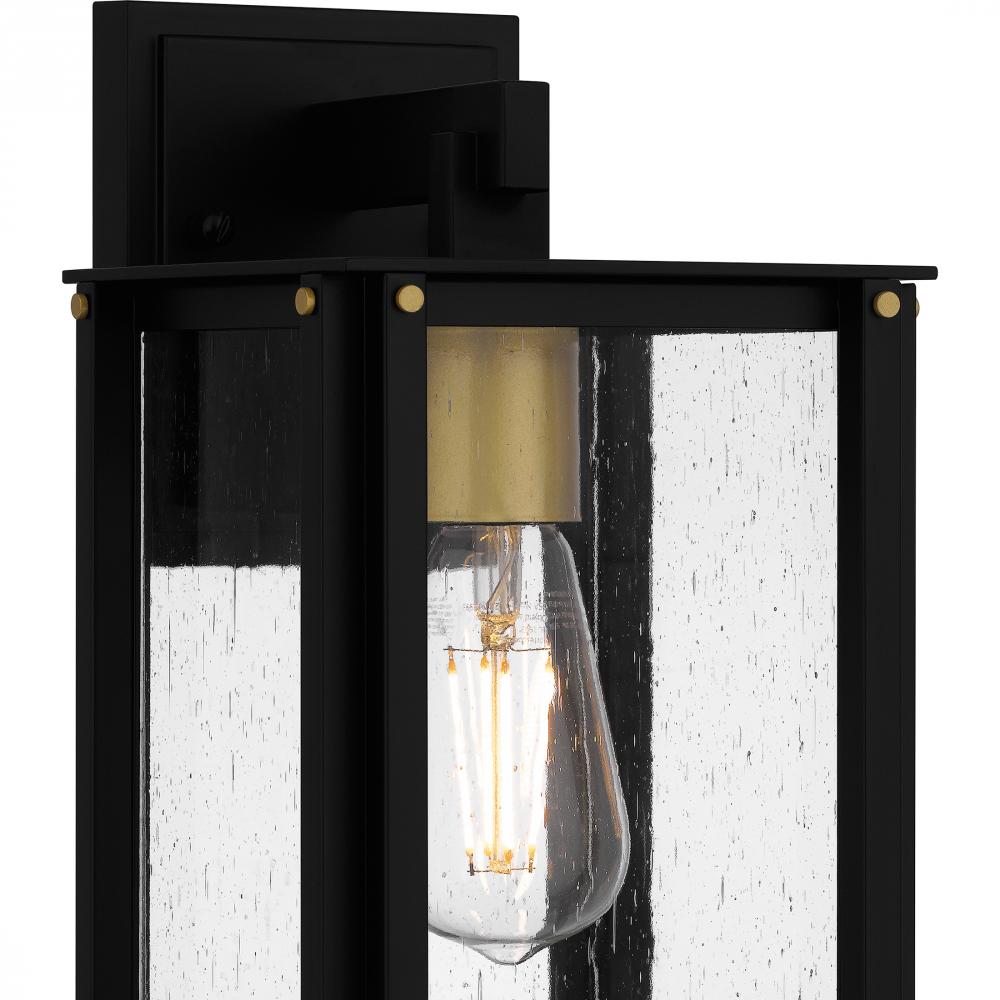 Robbins outdoor lanterns combine a classic silhouette with industrial style details. Gold decorative accents add a hint of luster to the matte black frame, while clear seedy glass panels maximize illumination and intrigue. Robbins is available as a post la