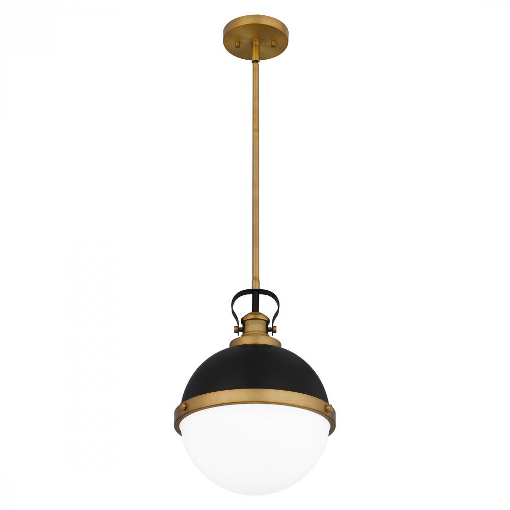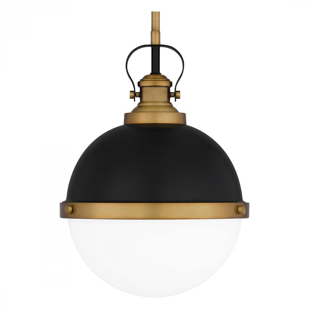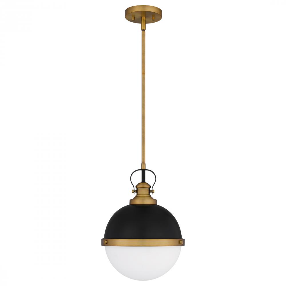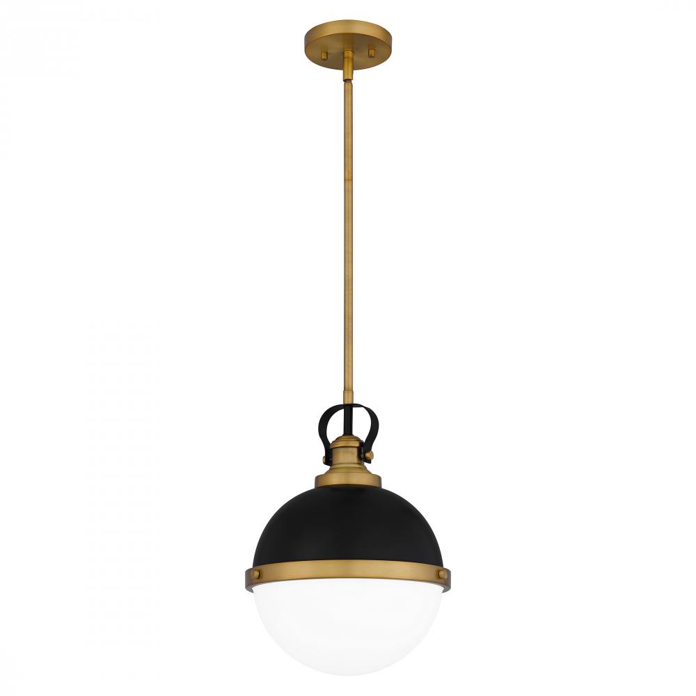 Sullivan’s spherical shape packs aesthetic punch. This handsome pendant features an opal-etched glass shade paired with a matte black finish and brass trim. Try a trio of these lights in the kitchen, or use one on its own in the foyer.