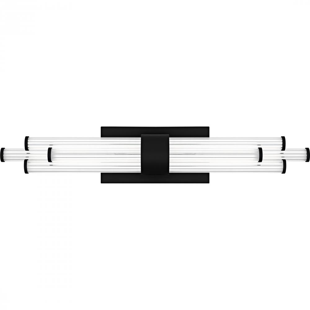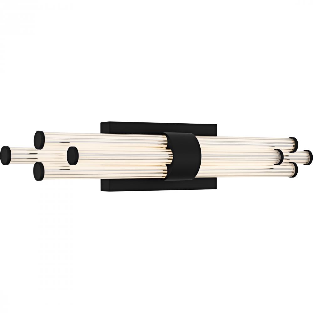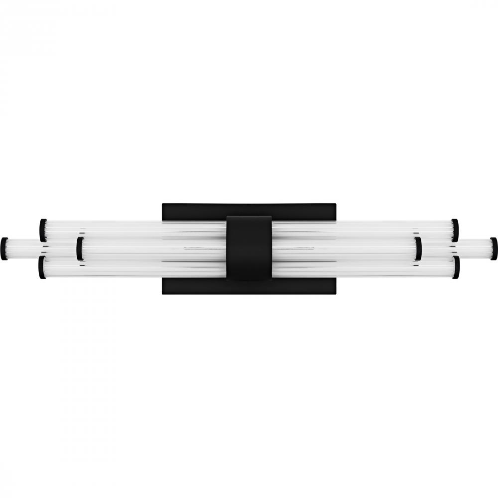 The Talbott bath light features a striking modern design with a sleek, minimalist aesthetic. The rectangular backplate contrasts with the series of parallel cylindrical acrylic rods, creating a unique and eye-catching visual. Each rod houses an integrated