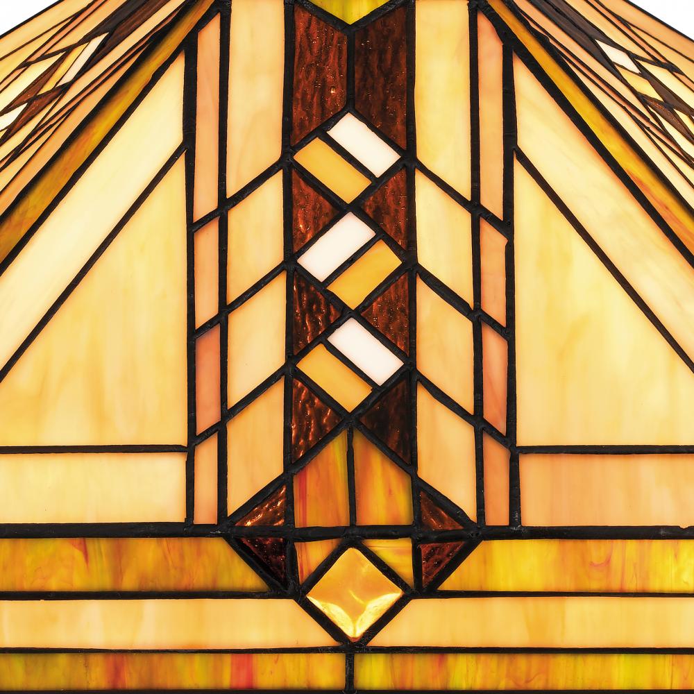 With its matte black finish and classic Arts and Crafts inspired design, the Yellowstone table lamp delivers on both style and function. The geometric shade is made of handcrafted Tiffany glass in shades of cream, warm honey amber, and crimson. The individ