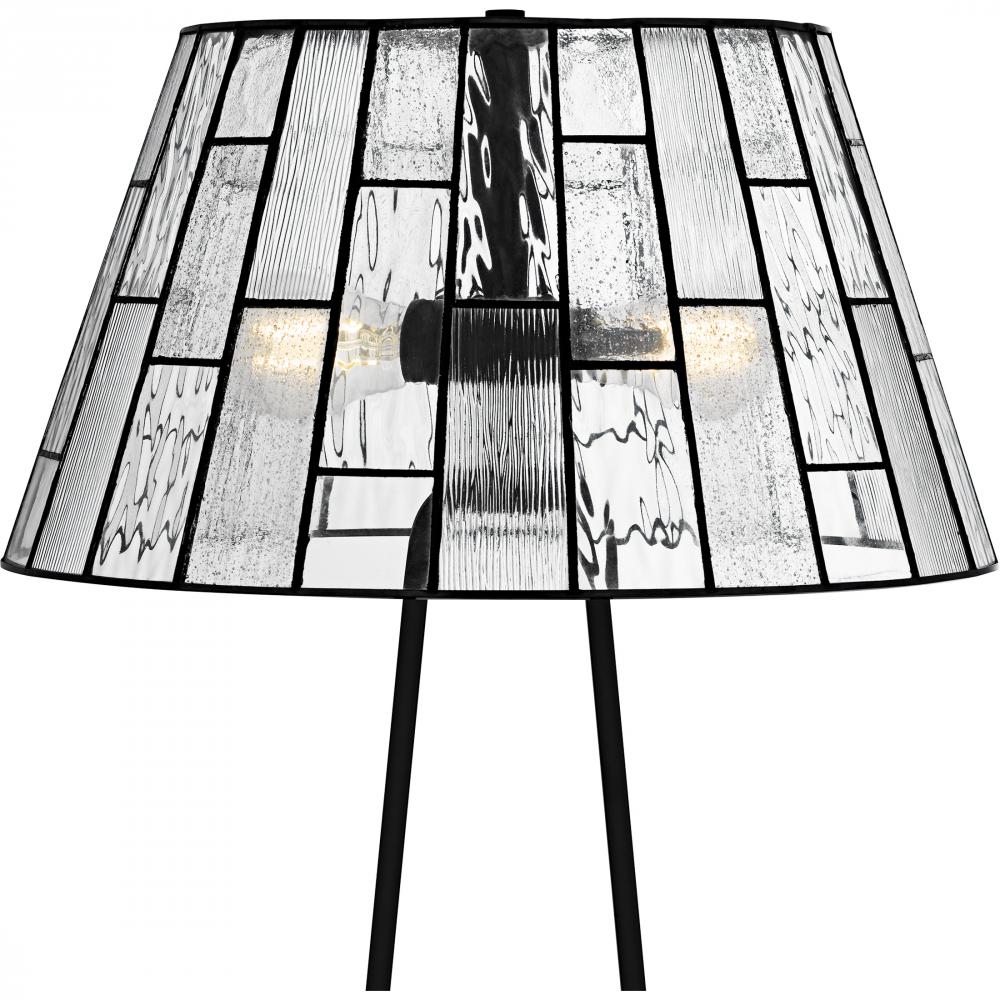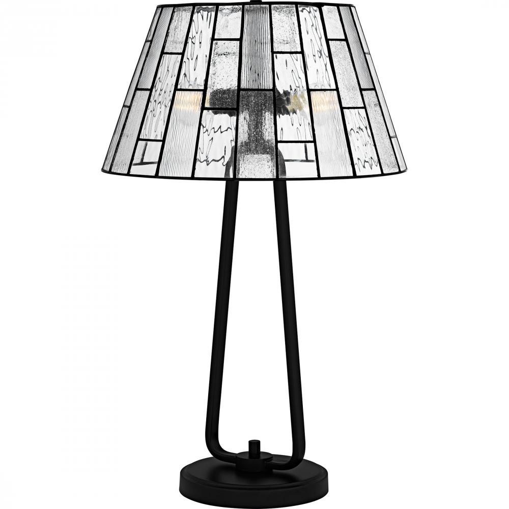 Rainiers traditional design adds simple sophistication to any space. Featuring a matte black finish that enhances its refined silhouette, this table lamp is complemented by Tiffany-inspired multitextured art glass panels, adding depth and visual interest t