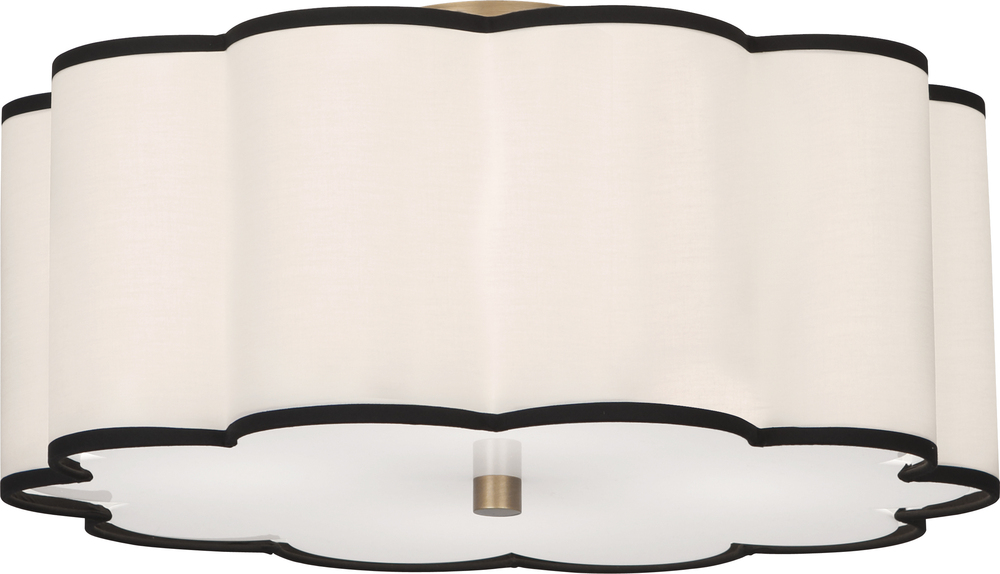 Aged Brass Finish Axis Flushmount with Scalloped Fondine Fabric Shade with Black Contrasting Trim - Axis features a scalloped design that diffuses the light in a most inviting way and also adds an elegant touch that is subtle and charming.