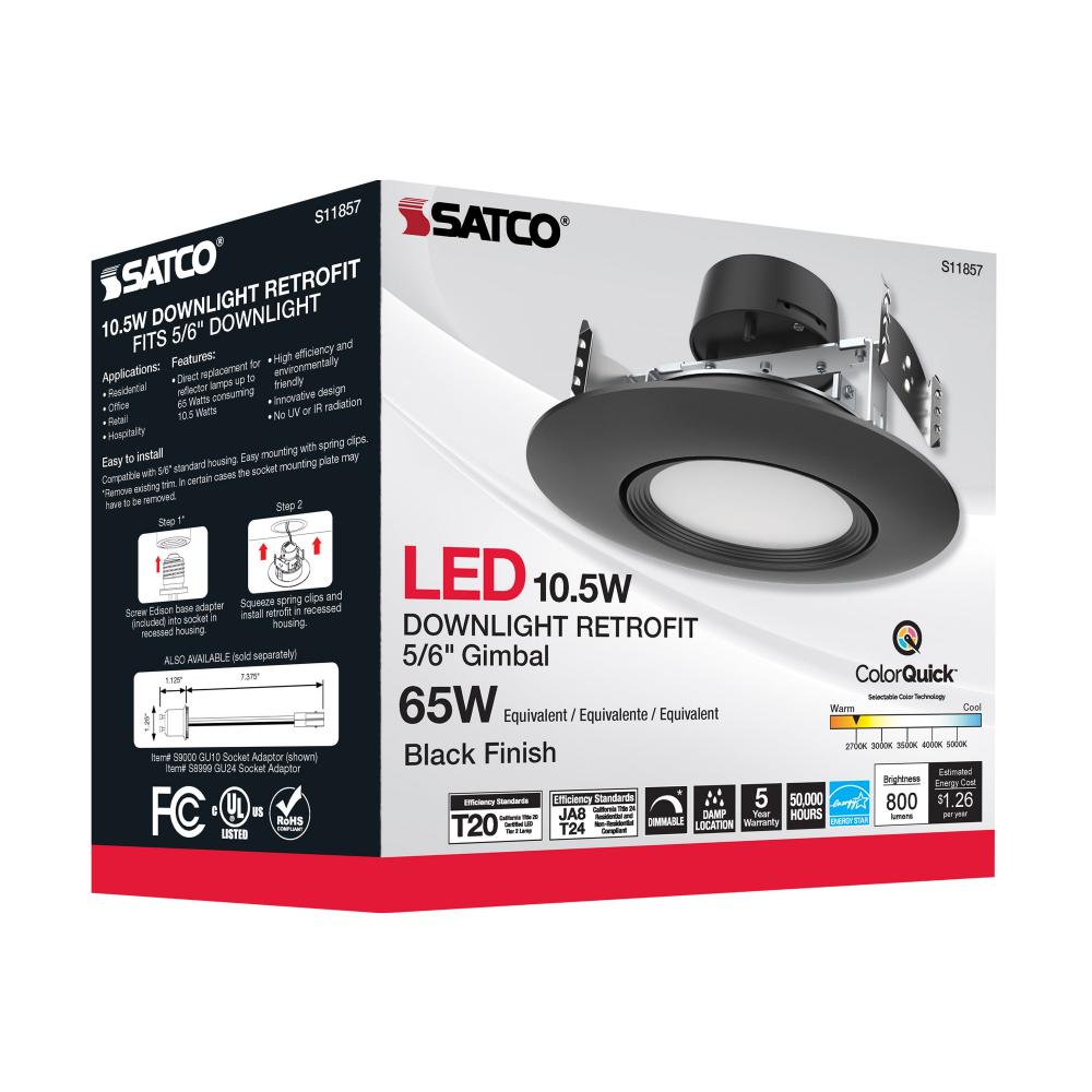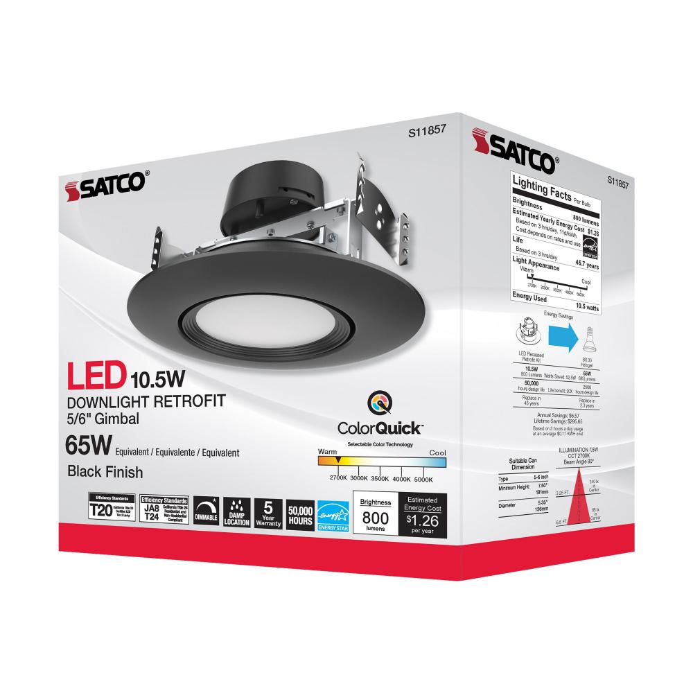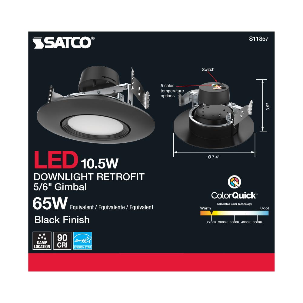 Satco's S11857 10.5 watt gimbaled LED downlight is a sleek lighting solution for residential and commercial applications. Illuminate kitchens, dining rooms, and office spaces with this CCT selectable fixture. Versatile and functional, this black trimme