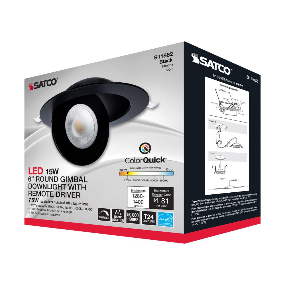 The black, six inch round, Satco S11862 gimbaled downlight delivers multiple advantages to any general recessed lighting project. Our ColorQuick technology allows the user to choose the color temperature from five different settings and brings the perfect