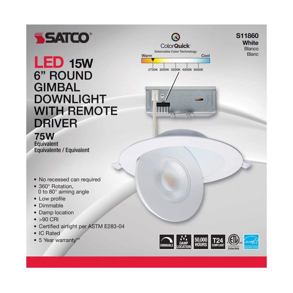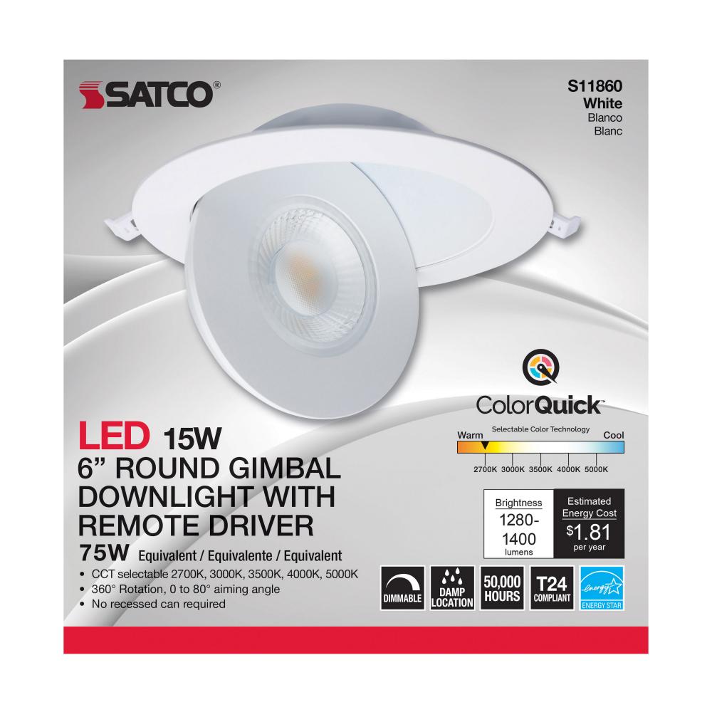 The white, six inch round, Satco S11860 gimbaled downlight delivers multiple advantages to any general recessed lighting project. Our ColorQuick technology allows the user to choose the color temperature from five different settings and brings the perfect