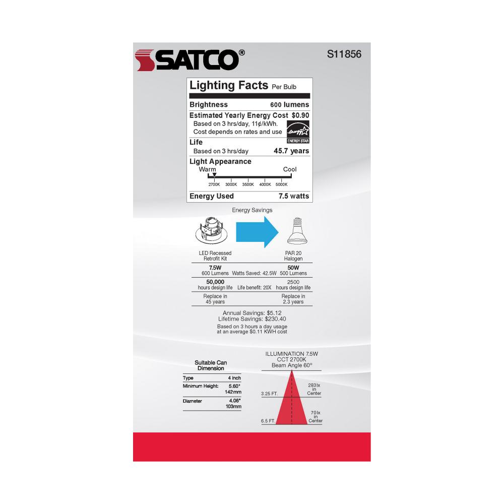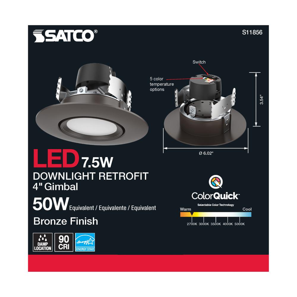 Satco's S11856 7.5 watt gimbaled LED downlight is a sleek lighting solution for residential and commercial applications. Illuminate kitchens, dining rooms, and office spaces with this CCT selectable fixture. Versatile and functional, this bronze trimme