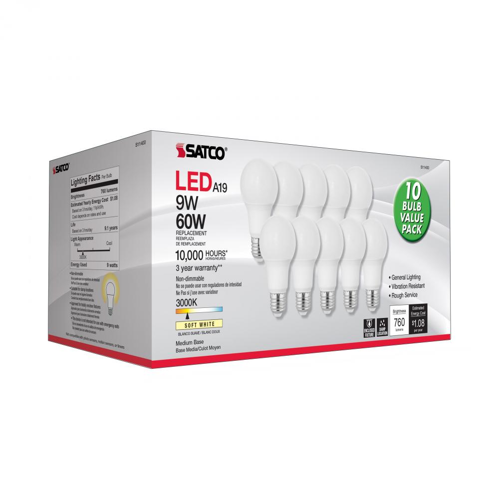 9 Watt A19 LED; 3000K; Medium base; 220 deg. Beam Angle; 10-Pack