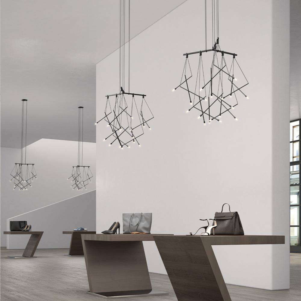 A three-bar configuration, in 120-degree orientation to each other with a fixed center hub, supports six Branch Luminaires with two on each of the three arms. Joined in an organic arrangement, the stems of this delicate lighting branch are suspended by cords to a single point of connection.