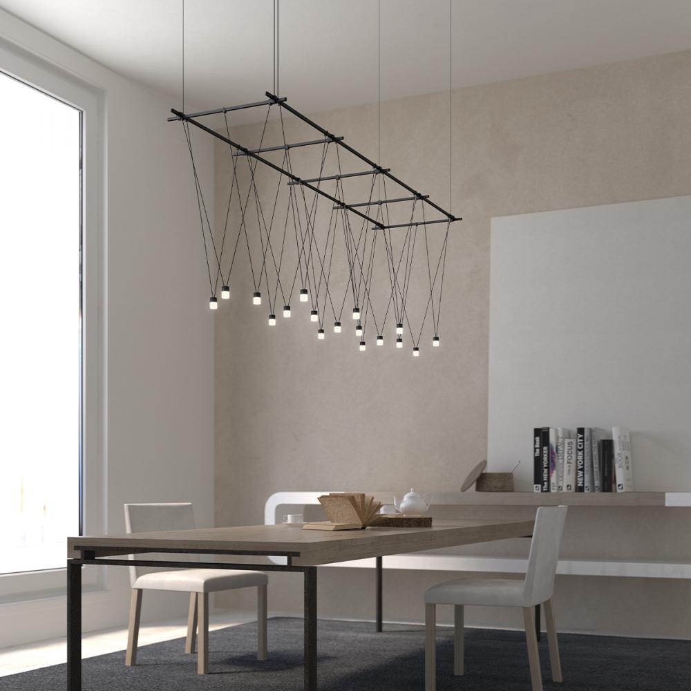 Power Bars form a linear planar Gridscape, which can be constructed in a variety of overall sizes and cellular scales. Any of dozens of Luminaire options can be fixed to or suspended from any position along the intersecting Power Bars. Here, etched glass V-Line Cylinders are suspended in a crossover pattern along the open planar grid.