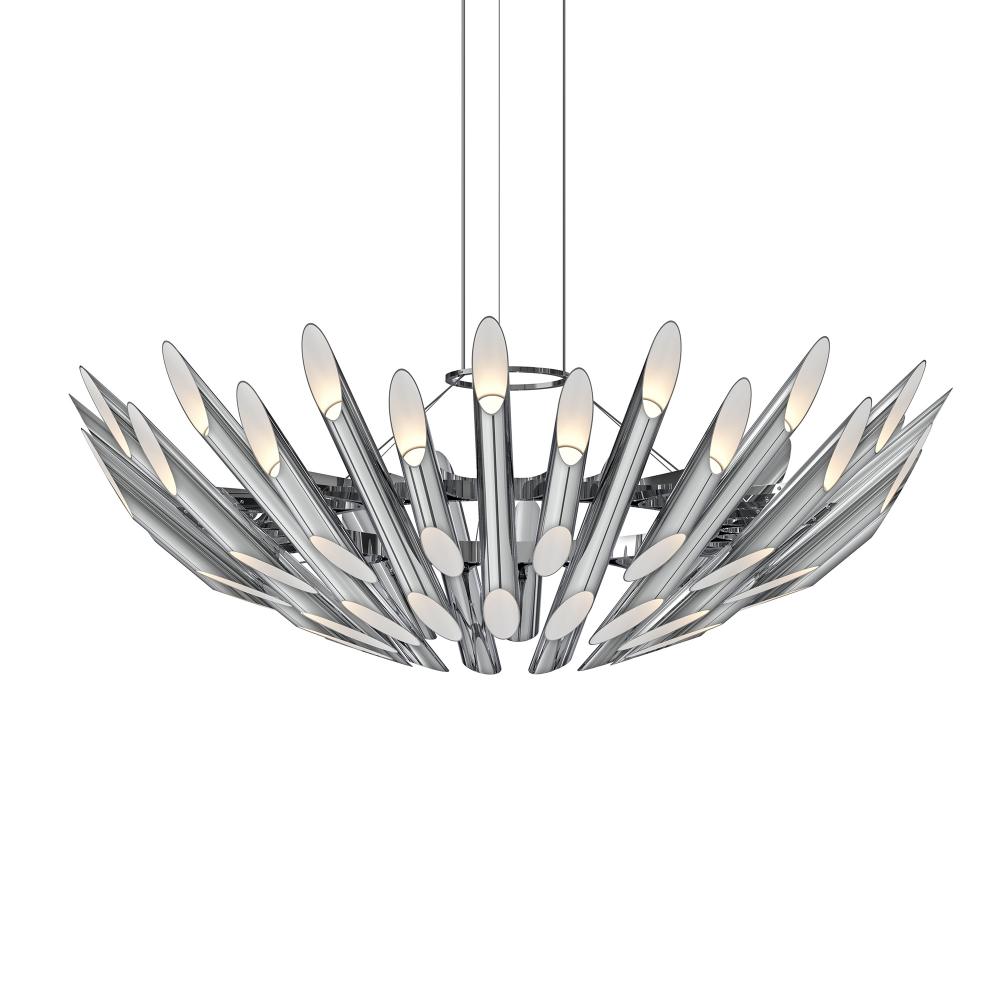 Unified and balanced, Chimes chandeliers and the complementary offer an elegant decorative rhythm of angular slashed LED-illuminated tubes composed to maximize the optical effects of metal finishes and light. Chimes presents a dramatic, decorative metal rhythm that invokes classic mid-century interiors. This luxury statement piece can be scaled for residential, hospitality and commercial settings for an enduring modern presence.