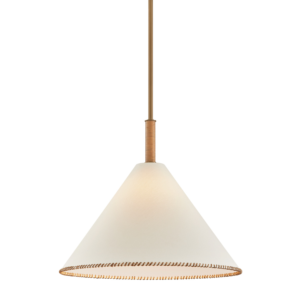 The architectural design language of the Stoney family is softened by its unique material qualities. Large conical white linen shades are edged with contrasting whip-stitching, echoing the natural jute wrap details along the Patina Brass frames. Available as a 1-light sconce, 1-light pendant, 5-light chandelier, and 1-light floor lamp, Stoney is an ode to craftsmanship.