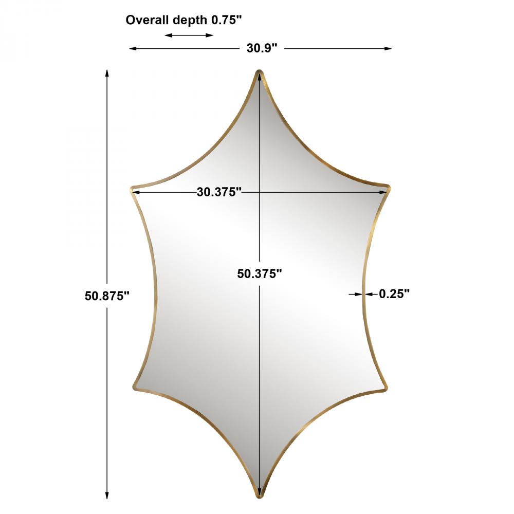 Perfect for An Entryway or A Stunning Over The Sofa Display, This Transitional Mirror Features A Uniquely Shaped Stainless Steel Frame with Gracefully Curved Points Finished in Classic Brushed Gold. May Be Hung Horizontal or Vertical.