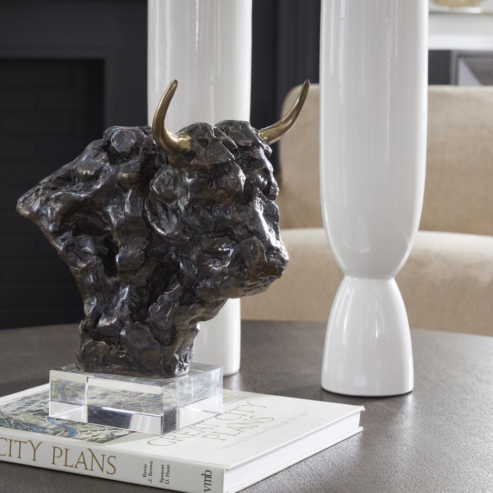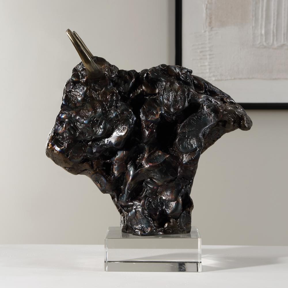 Introducing Our Exquisite Bison Bust, A Majestic Symbol Of Strength And Elegance. Crafted In Tarnished Bronze With Gleaming Gold Antlers, This Stunning Piece Exudes Timeless Sophistication. Poised Atop A Shimmering Crystal Base, It Commands Attention And Adds A Touch Of Luxury To Any Space.