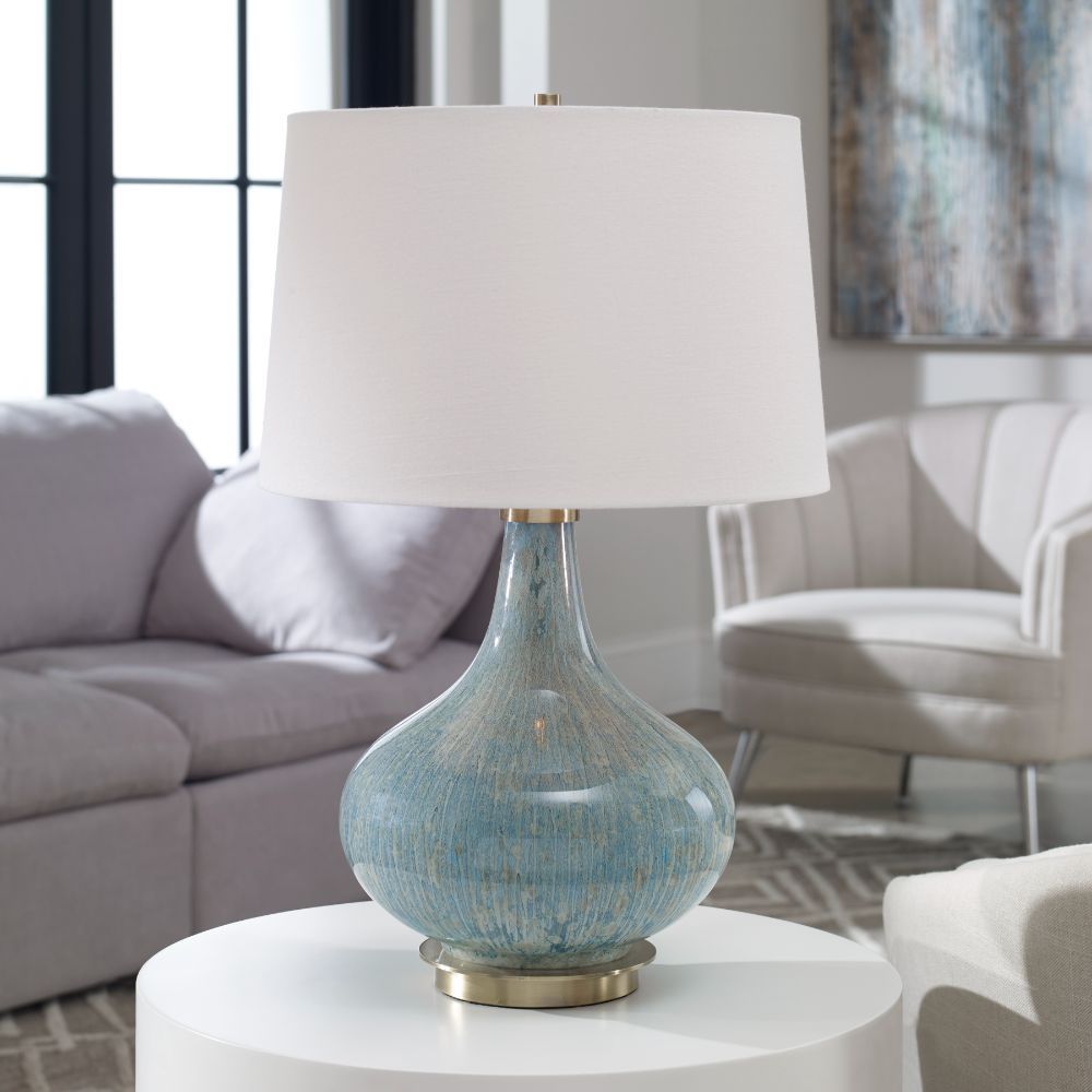 Mottled, Light Blue Gray Glass Accented with Plated Brushed Brass Details. The Slightly Tapered Round Hardback Shade is An Ivory Linen Fabric with Light Slubbing.