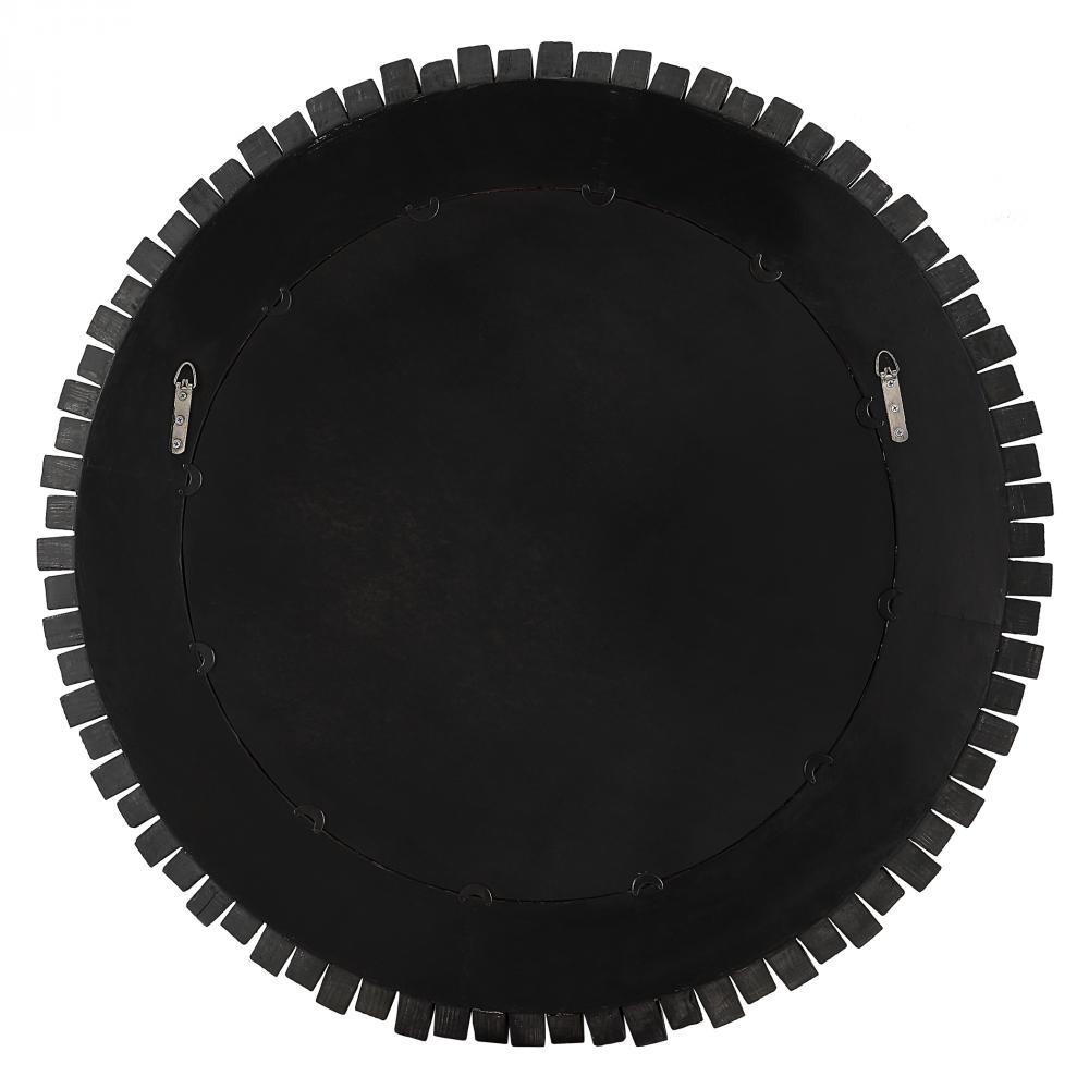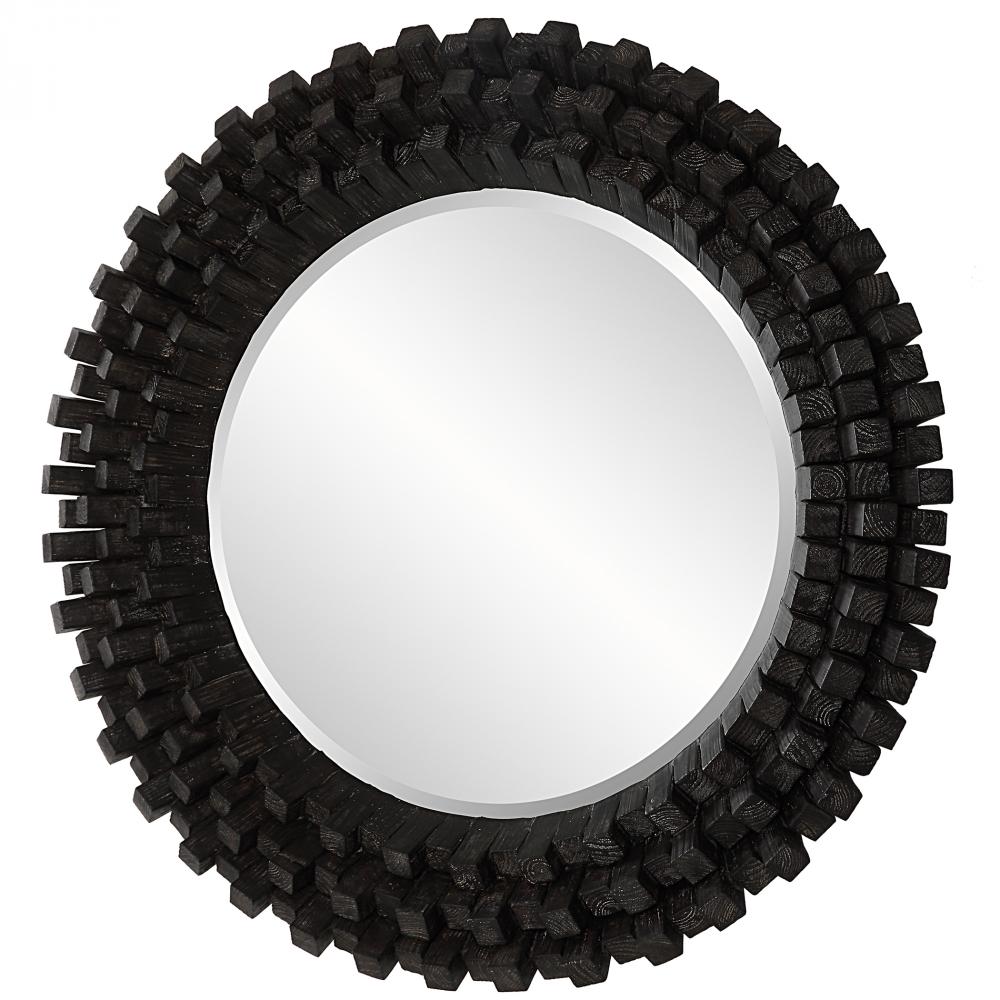 This Round Wood Mirror Has A Contemporary Rustic Flair By Featuring Angled Pillars of Solid Wood Stacked in Alternating Heights for A Dramatic and Unique Display, Finished in An Ebony Stain with A Subtle Gray Wash. Mirror Has A Generous 1 1/4" Bevel.