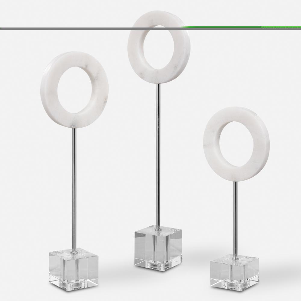 Contemporary Trio Features Solid White Marble Rings Supported By Polished Chrome Rods and An Elegant Crystal Base. Sizes: S-6x15x3, M-6x19x3, L-6x22x3