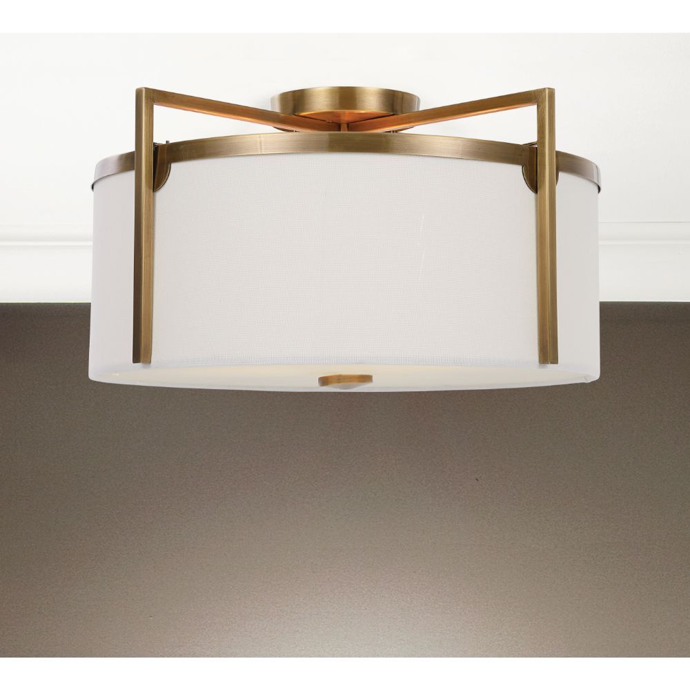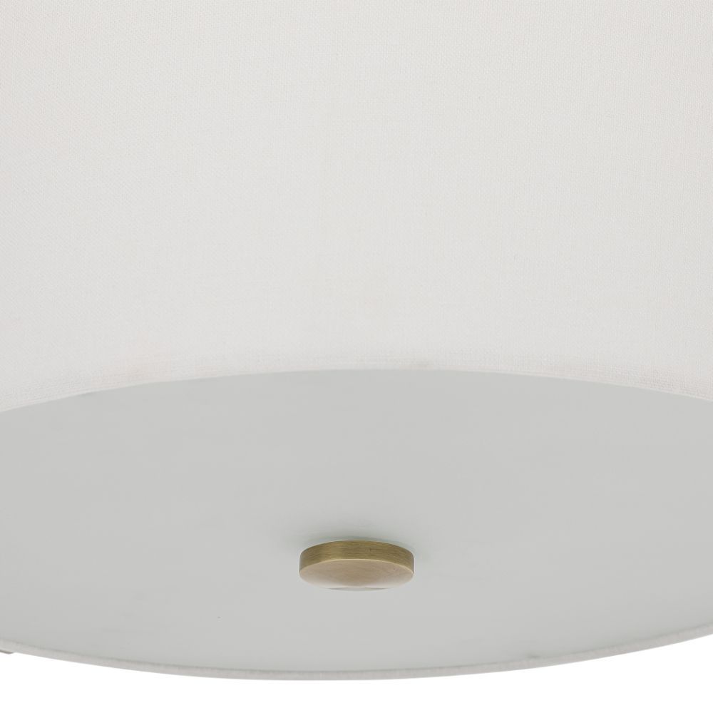Chic and Versatile with Clean Lines This 3 Lt. Semi Flush Mount Features An Antique Brass Finish with Off-white Linen Hard Back Shade with A Central Frosted Glass Diffuser. 3-100 Watt Max, Edison Sockets. Bulbs Not Included.