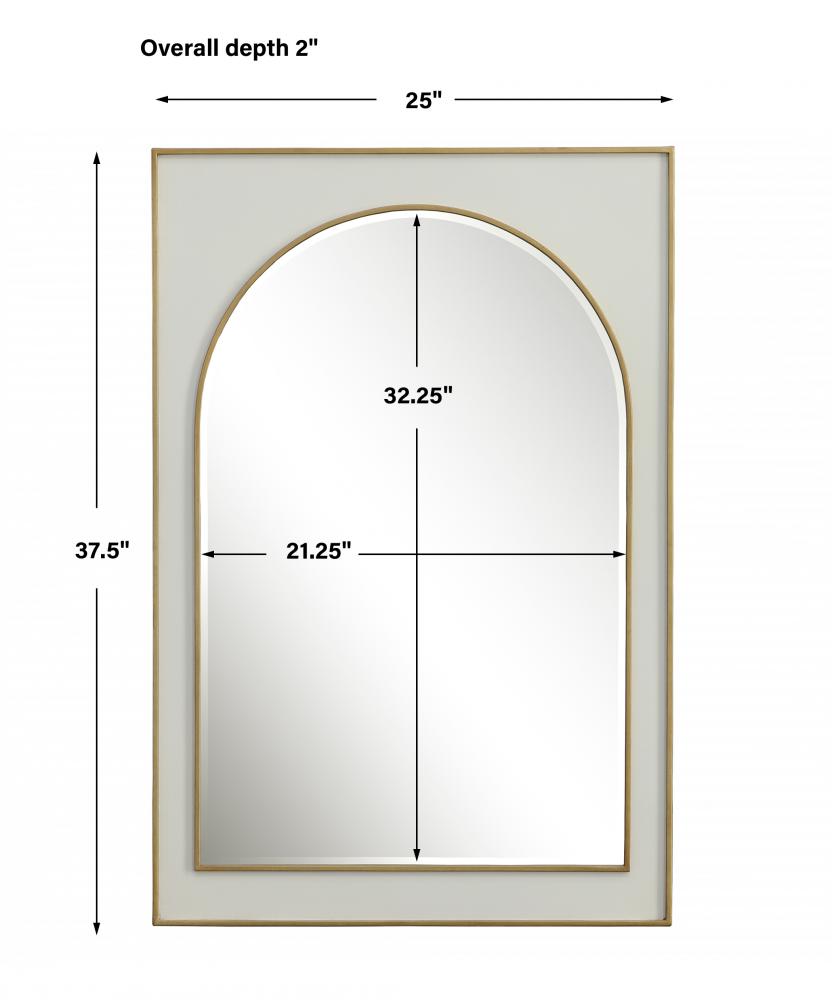 This Iron Mirror Showcases A Gloss White Finish Surrounding The Classic Arch Shape, Accented with Raised Edges Finished in A Lightly Antiqued Gold Leaf. The Mirror Has A 1" Bevel.