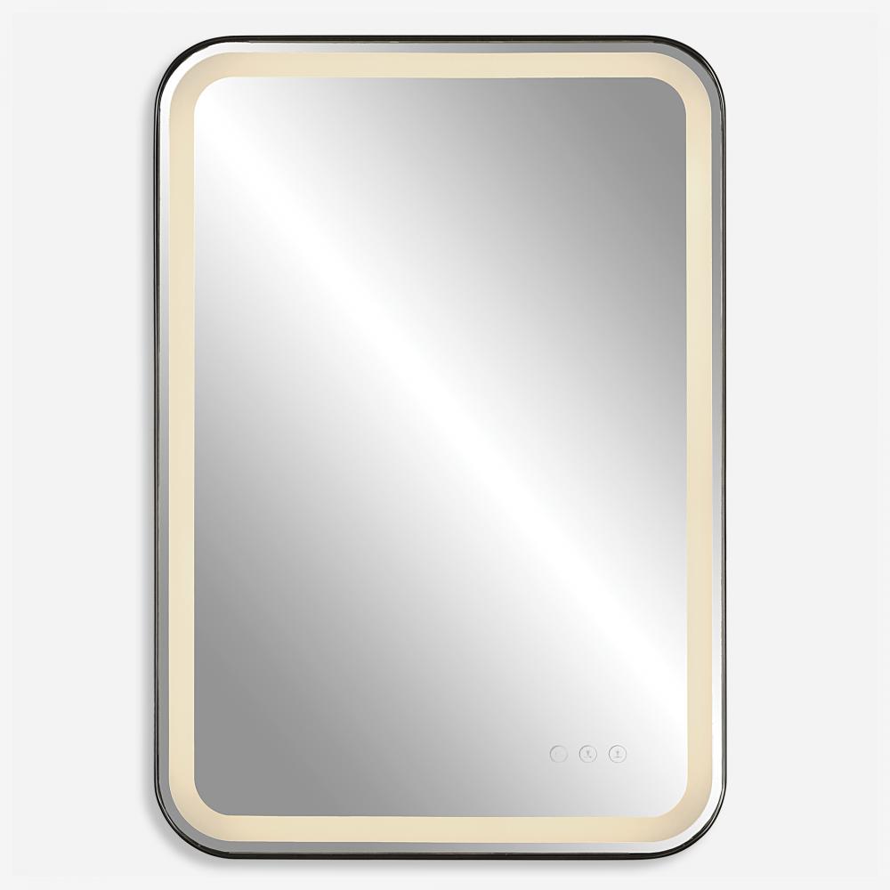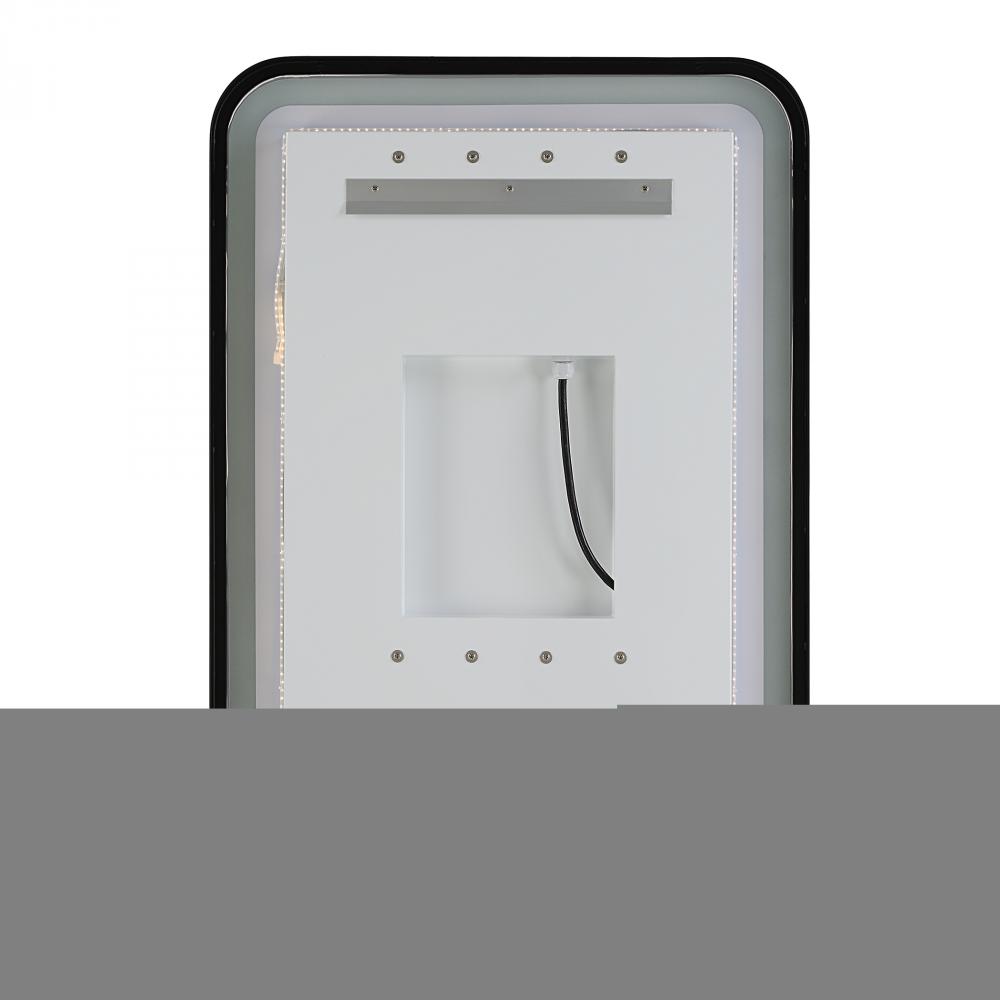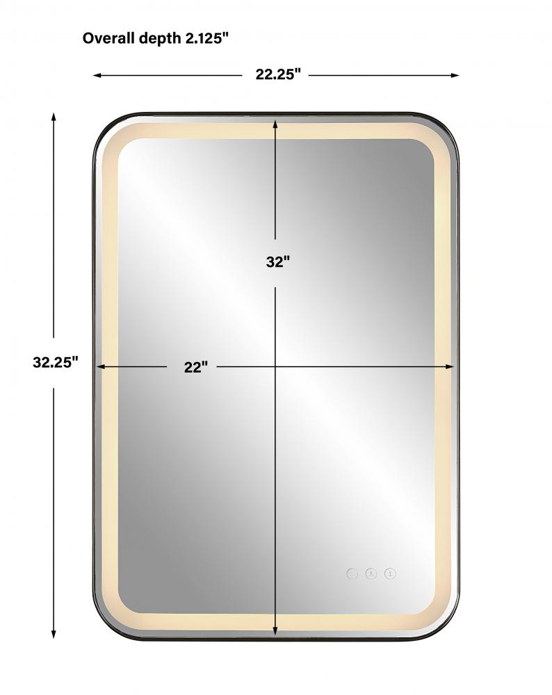 Versatile in Design, This Vanity Mirror Has Integrated LED Lighting That Illuminates Through The Frosted Strip in The Polished Edged Mirror. The Satin Black Metal Frame is Off Set From The Wall to Allow Ambient Lighting From The Back. Easy to Use Touch Buttons Are Featured on The Bottom Right of The Mirror with An on Off Function, Touch and Hold Kelvin Control From 2700k to 4000k, and Touch and Hold Brightness Control. LED Lights Rated At 40,000 Hours. Ships with Plug, But Can Be Hardwired Professionally.Touch Screen Icons Continue to Illuminate When Powered Off for Easy Navigation in Dark Settings.
