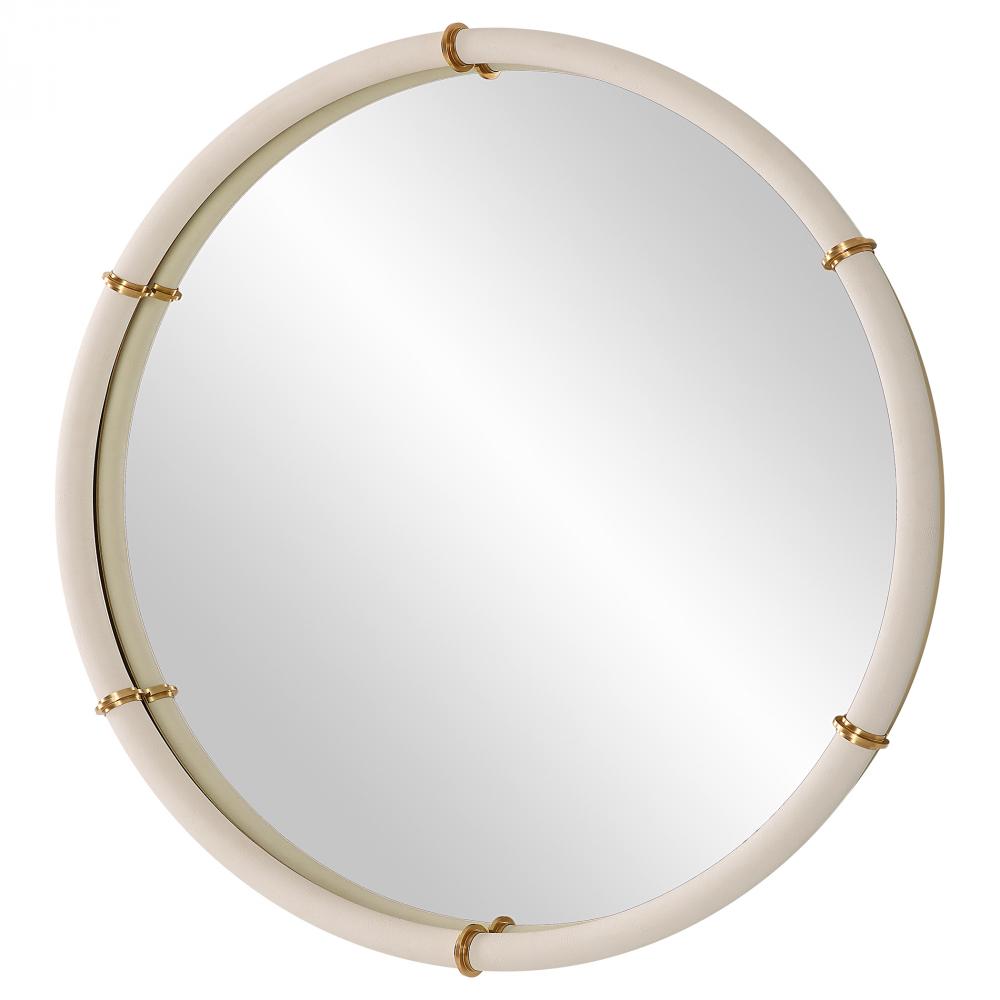 The Cyprus Round Mirror Showcases A White Faux Shagreen Leather Wrap Featuring Brass Plated Steel Bands That Help Elevate This Sophisticated Design.