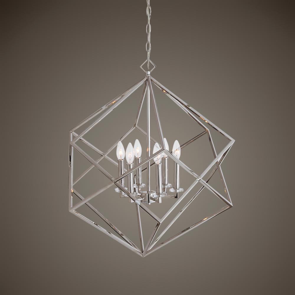 An Elegant, Polished Nickel Cube Interlocked with Its Twin, At The Center of Their Intersection is A 6 Light Candle Cluster with Mini Crystal Bobeches. 6-60 Watt Max, Edison Sockets. Bulbs Not Included. Supplied with 15' Wire and 7' Chain for Adjustable Installation.